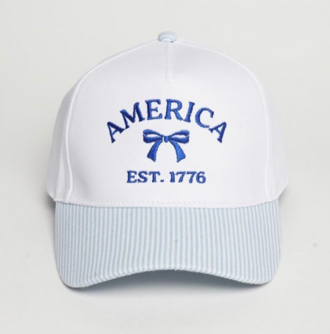 The America Blue Bow Hat features a distinctive design with "America" prominently displayed, complemented by a blue bow and a blue and white striped brim. This combination offers a visually appealing accessory that enhances outdoor attire while providing sun protection with its wide brim, contributing to comfort during outdoor activities.