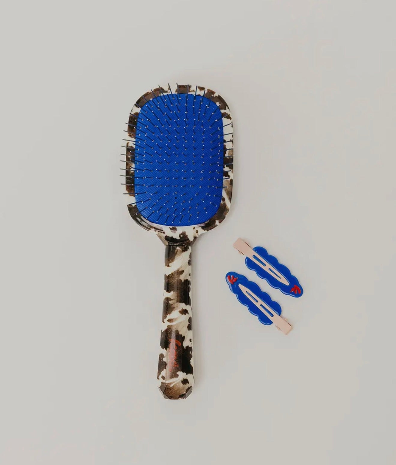This brush comes in the cutest cow print pattern with royal blue accents!