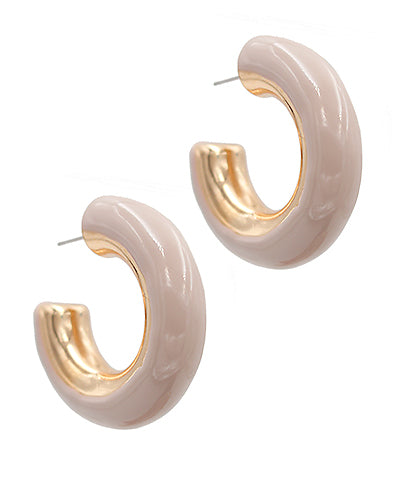 The Light Taupe Chunky Enamel Hoop features a robust metal construction with a durable enamel finish. Measuring 1 5/8 inches in length, this hoop earring employs a post design for secure wear. Its design enhances versatility, making it suitable for various occasions.
