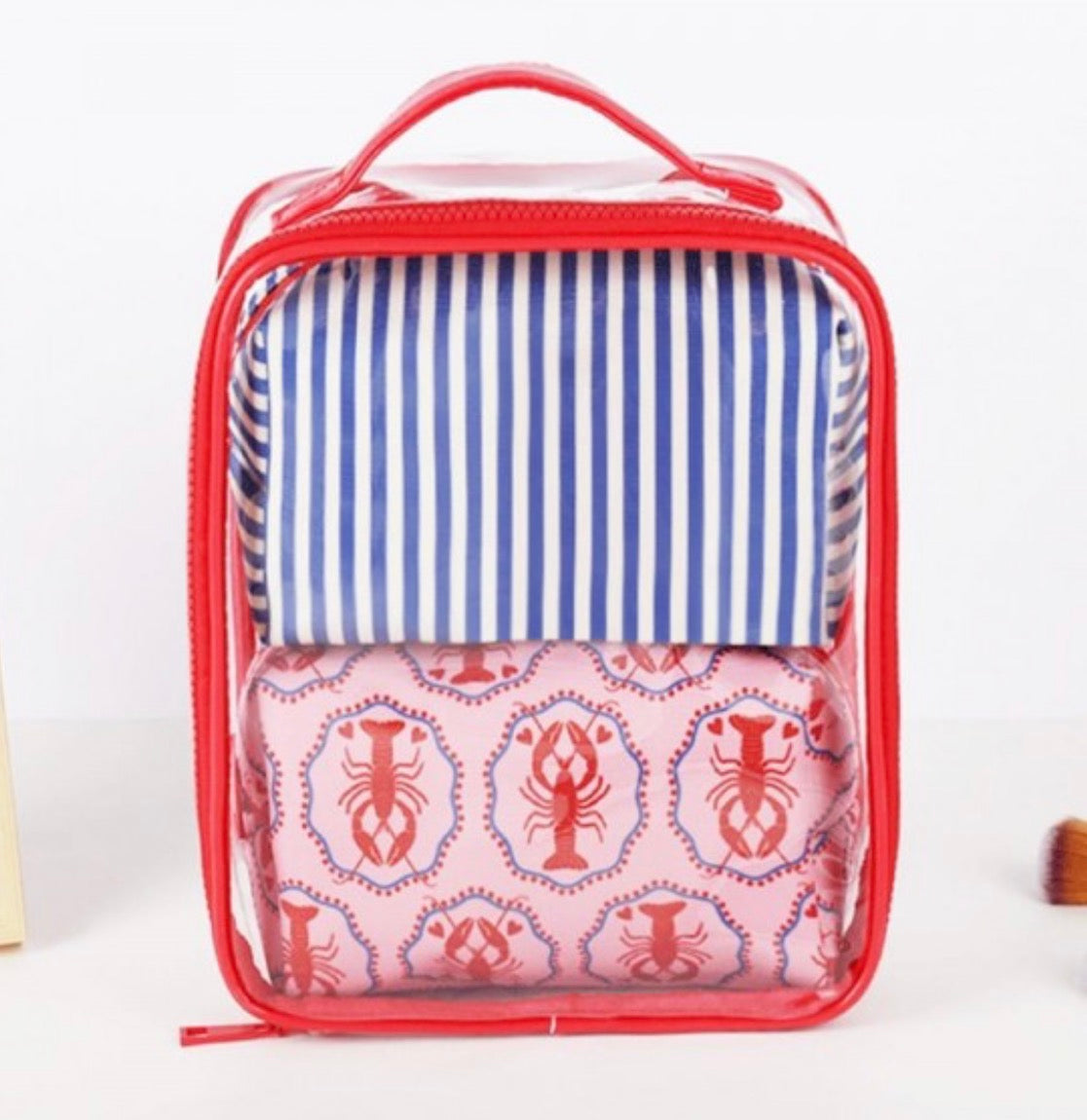 The Lobster & Striped Makeup Bags combine vibrant lobster motifs with classic stripes, providing a stylish storage solution for cosmetics. Made from durable materials, these bags enhance organization while ensuring longevity. Their design caters to users seeking both aesthetic appeal and practical functionality, ideal for daily use or travel.