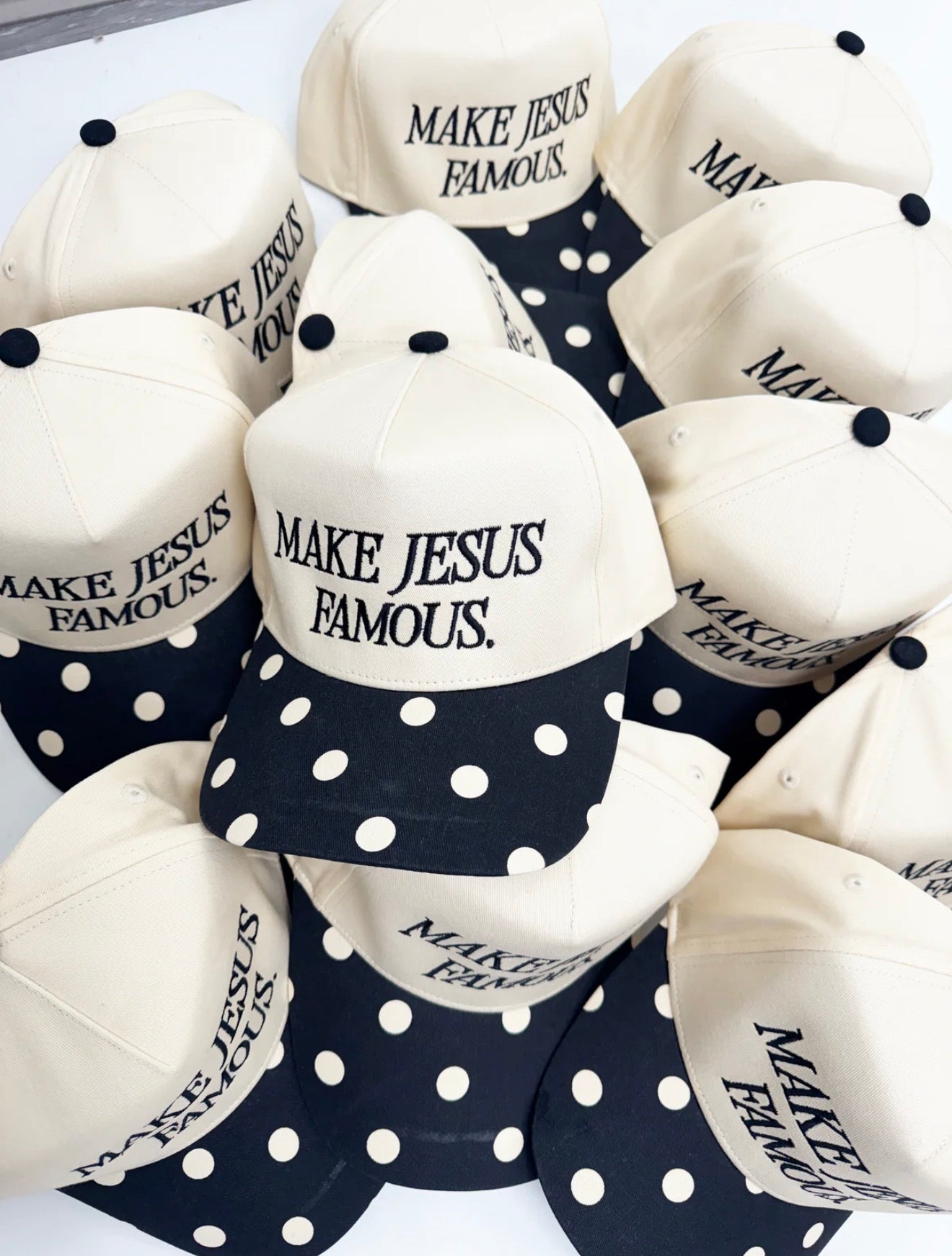 Add a splash of fun and faith to your look with the Make Jesus Famous Polka Dot Hat. Its cheerful polka dots bring a playful vibe, while the inspiring message spreads positivity wherever you go.