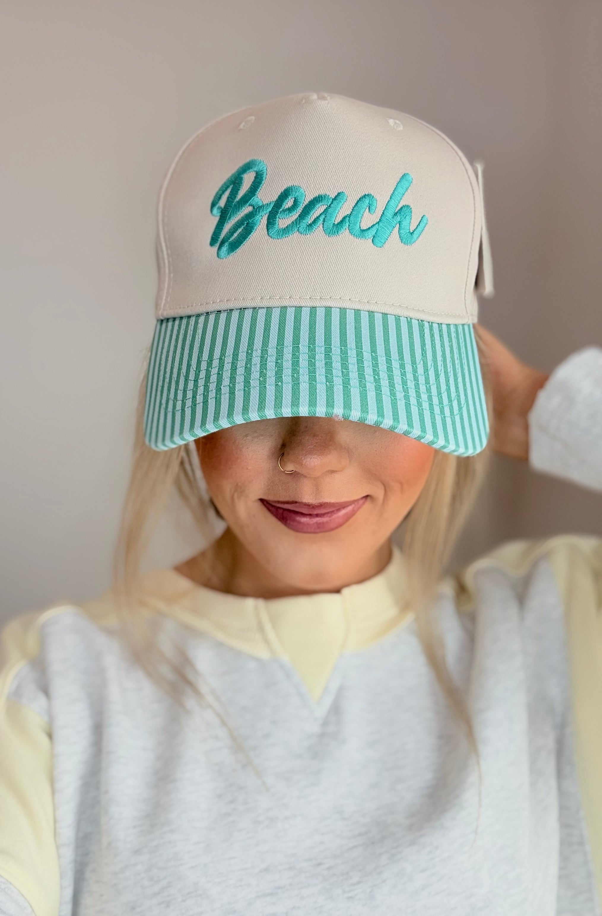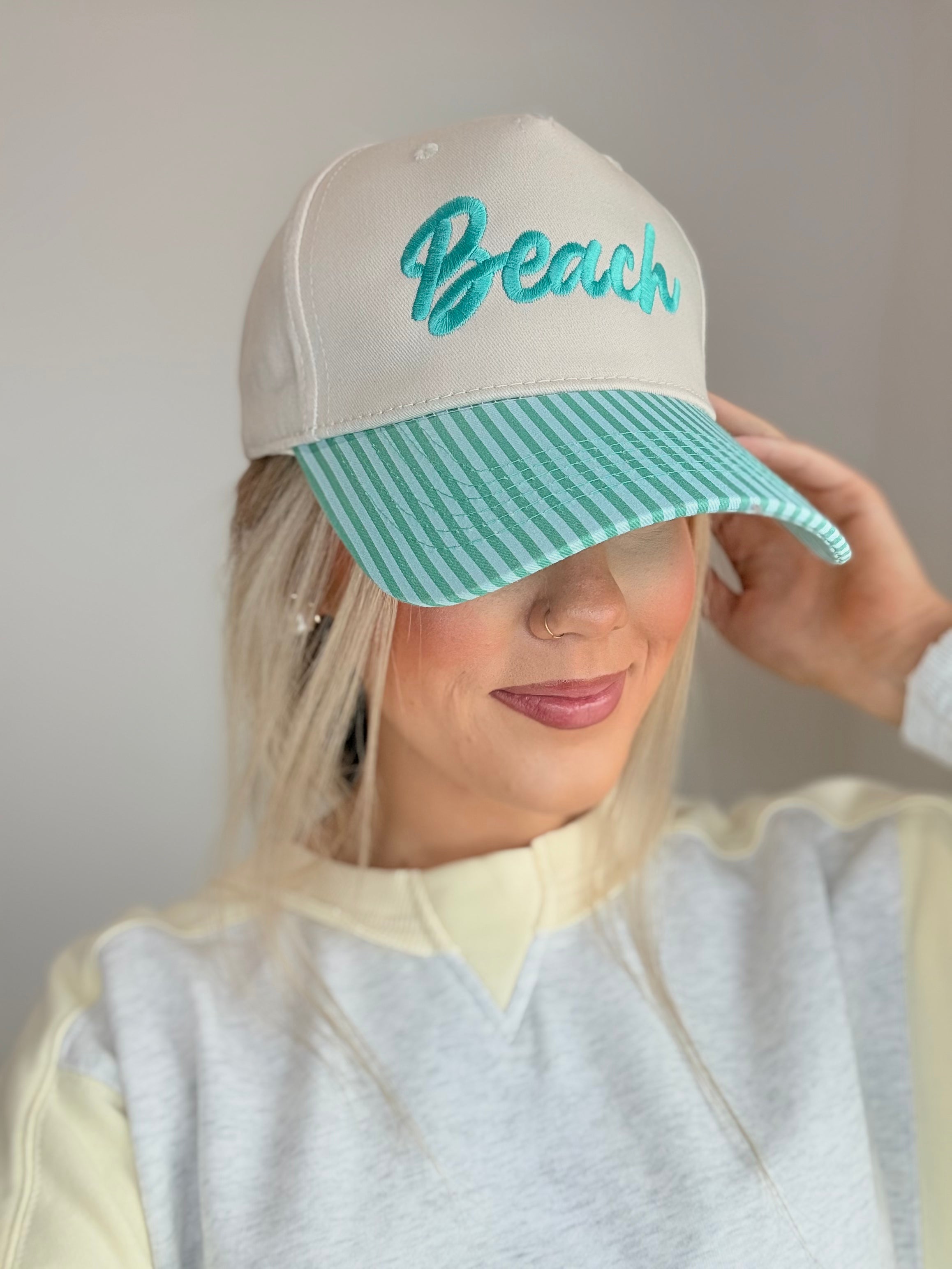 The Teal Beach Striped Hat features a beach-inspired design with a green and blue striped brim. This structured hat provides essential sun protection, reducing UV exposure by up to 98%. Its durable construction ensures longevity, making it an ideal accessory for outdoor activities.