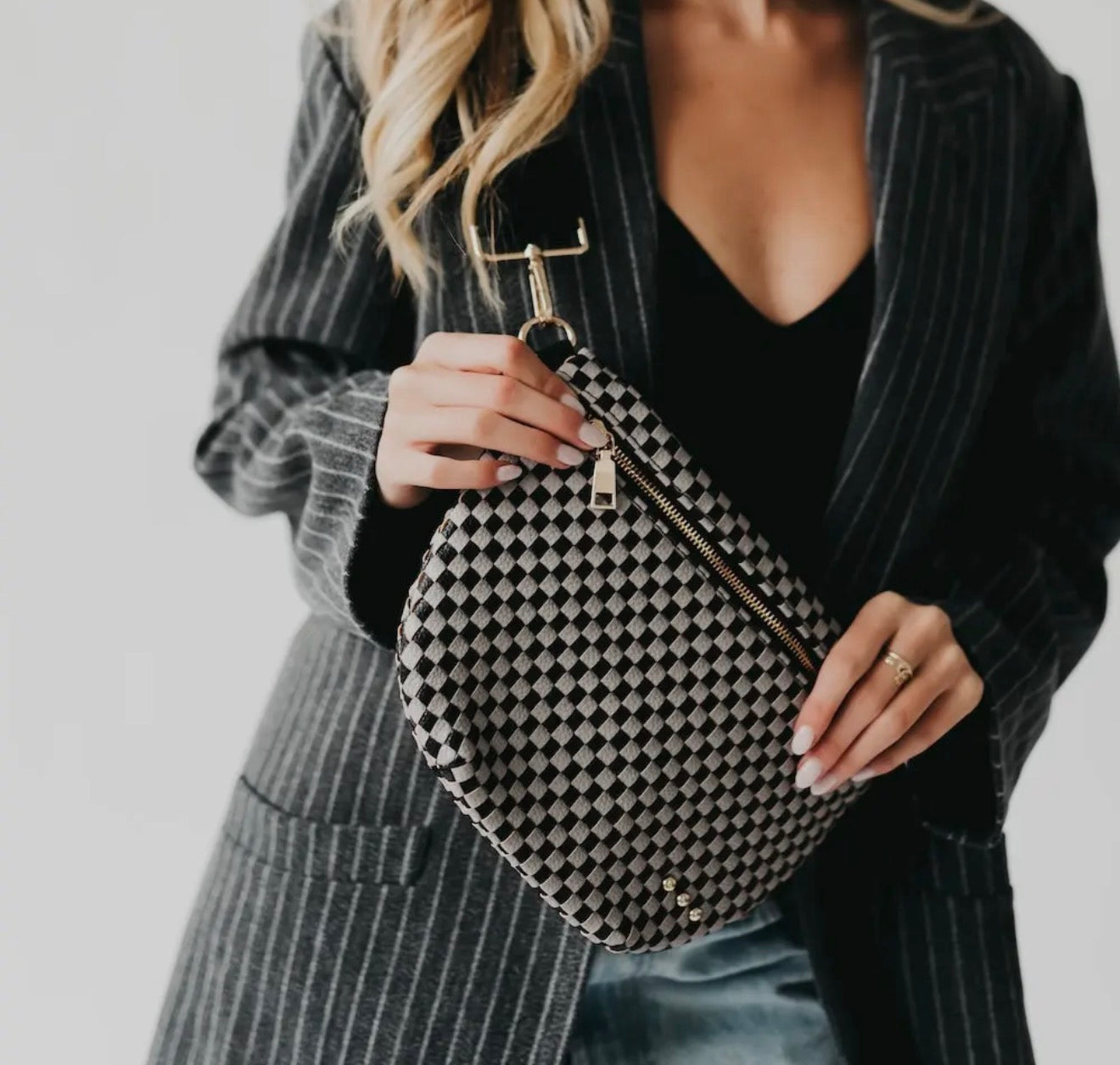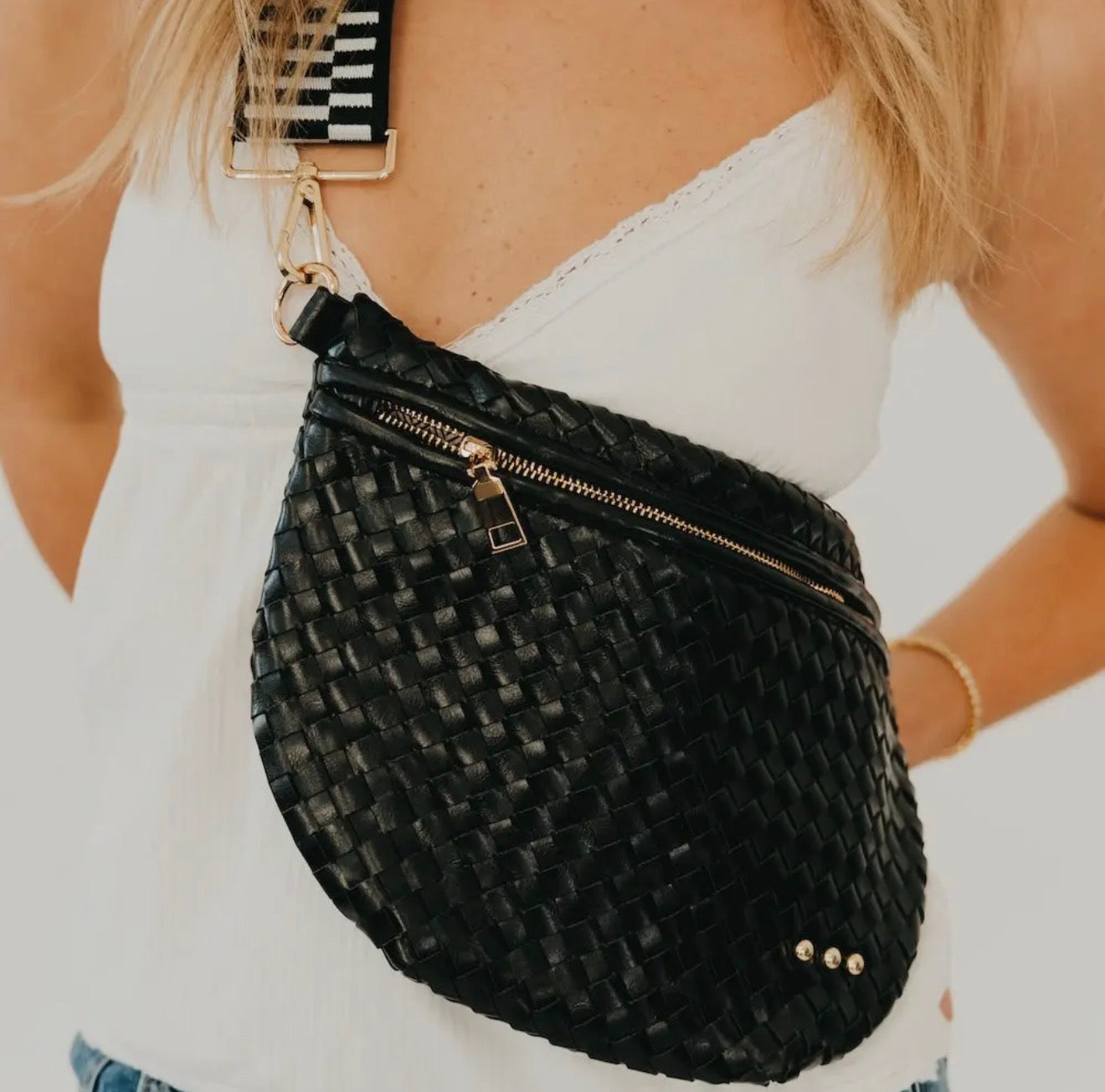 Our signature 3 Sister Studs are now officially trademarked and all of our Westlyns will now feature these iconic studs—just like the rest of our bags! Meet the Westlyn Woven Bum Bag! Gorgeous woven vegan leather available in solid colors with a unique block design on the strap gives us edgy, rocker vibes. We also have it available in checkered prints, and metallic! Beautiful hardware with a zipper closure with beige and black chevron interior, and a zippered slash pocket on the inside. This crossbody bag is the perfect accessory to elevate any outfit!