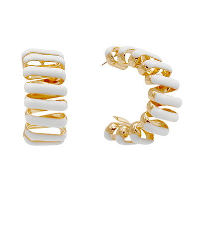 The White Enamel Spring Hoops are crafted from durable metal, ensuring longevity and resistance to wear. With a length of 1 1/4 inches, these hoops provide a sophisticated profile that complements various styles, making them a versatile accessory for both casual and formal attire.