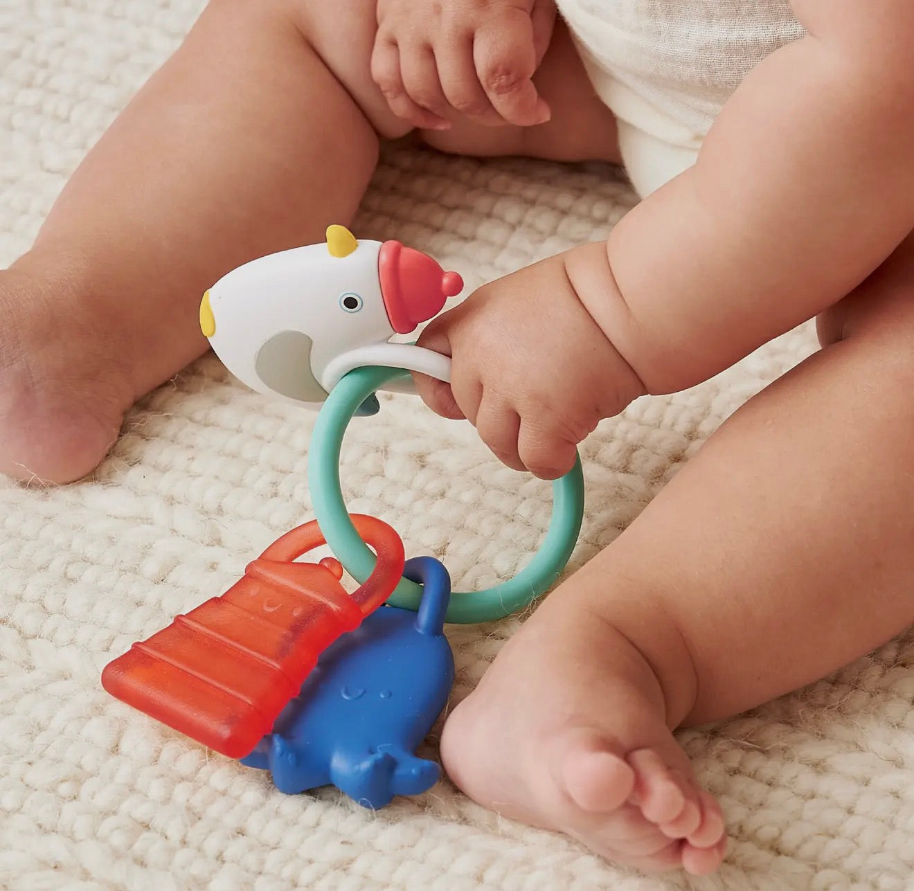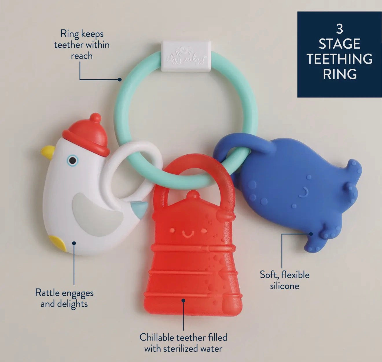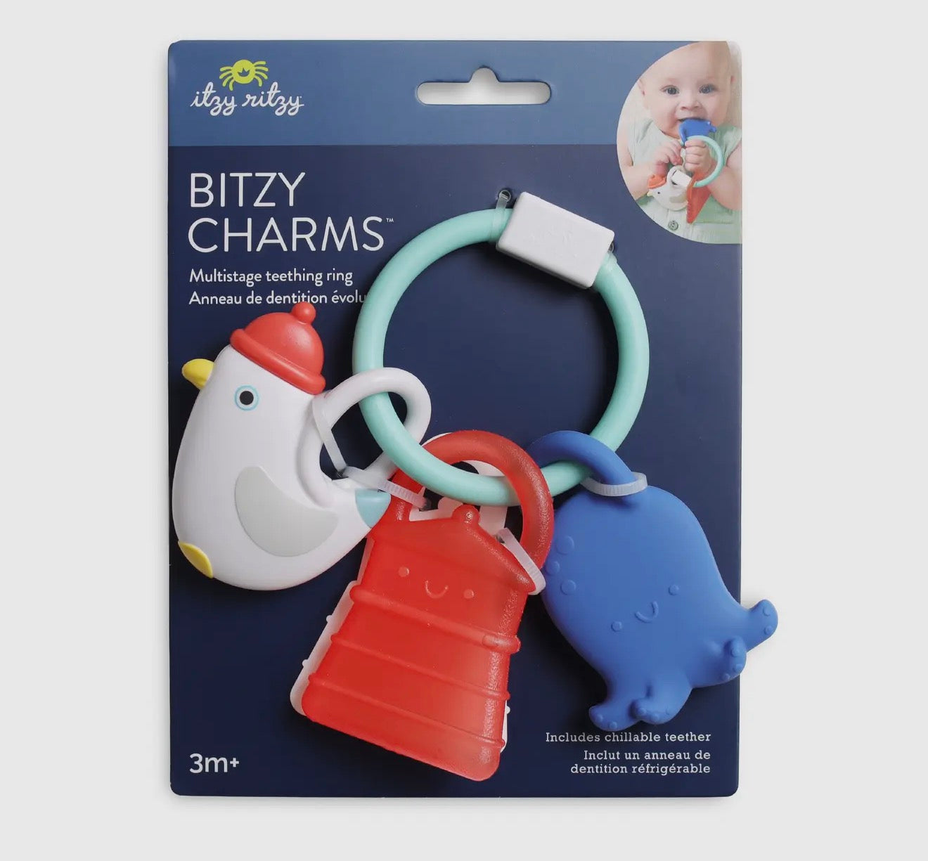 Three Times the Comfort! Need a teething solution that works like a charm? You've found it! Our Bitzy Charms teether engages baby three different ways: with a soft silicone teether to soothe sore gums, a rattle teether to teach cause and effect, and a chillable water-filled teether for extra relief.