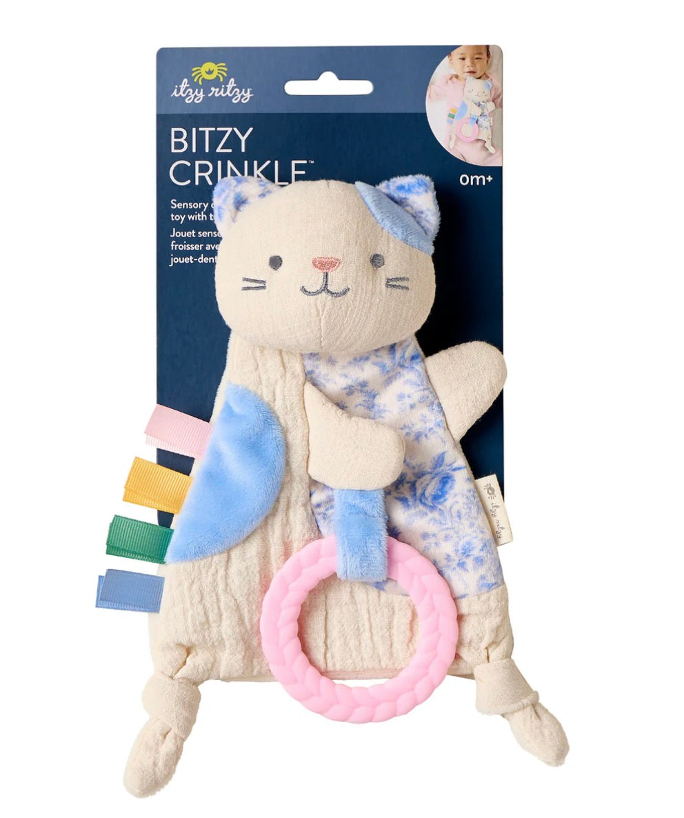 Meet Bitzy Crinkle™, a lovable sensory toy for babies that crinkles and excites. Part of Itzy Ritzy’s Bitzy Bespoke™ collection, this baby crinkle toy includes different elements for your little one to explore and enjoy. Features include soft natural cotton fabric (in the shape of an adorable animal), textured ribbons and a braided teether. Watch as your child is captivated by crinkles and giggles with their new friend!