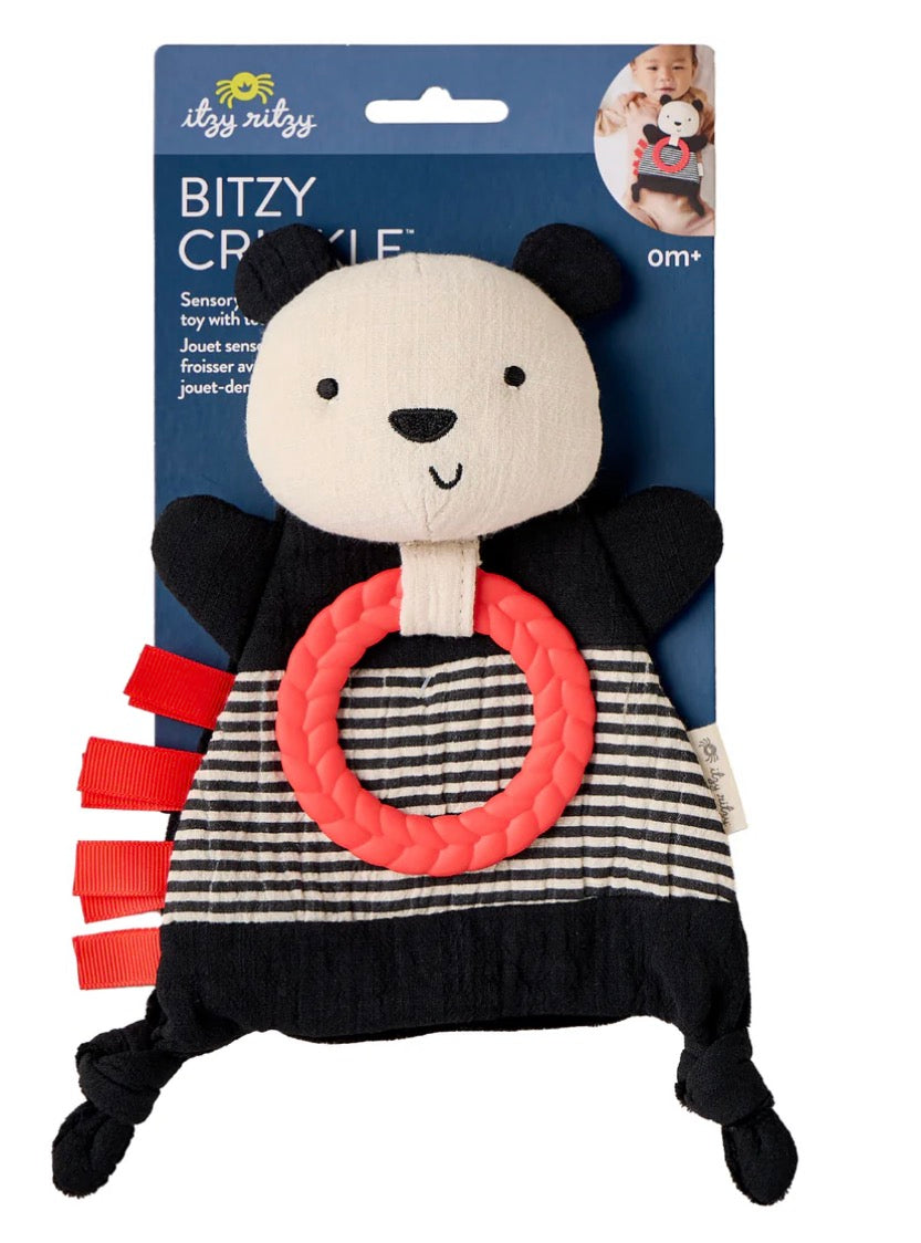 Meet Bitzy Crinkle™, a lovable sensory toy for babies that crinkles and excites. Part of Itzy Ritzy’s Bitzy Bespoke™ collection, this baby crinkle toy includes different elements for your little one to explore and enjoy. Features include soft natural cotton fabric (in the shape of an adorable animal), textured ribbons and a braided teether. Watch as your child is captivated by crinkles and giggles with their new friend!