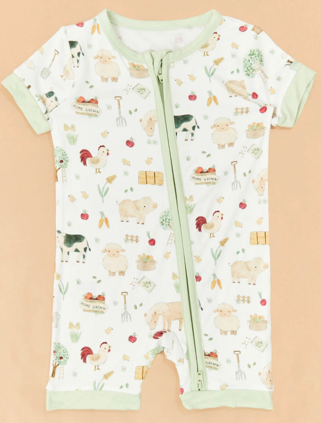 A sweet farm animal short-sleeve zip romper featuring a two-way zipper for easy changes. Made from soft, eco-friendly material that’s gentle on your little one’s skin.