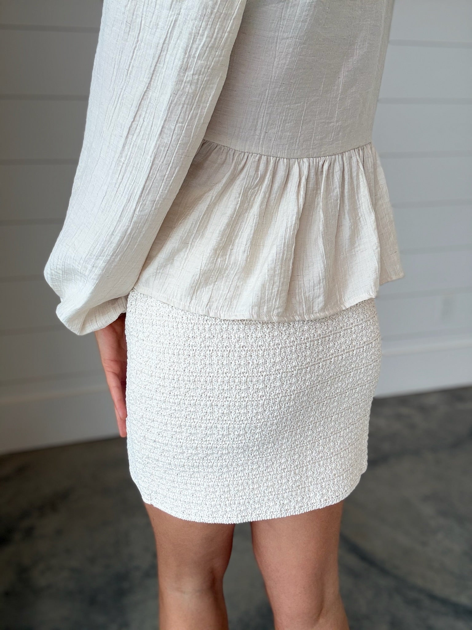 Meet your new go-to neutral. This cream textured mini skirt features a soft, cozy knit fabric with a subtle boucle-inspired finish that adds the perfect touch of dimension. Designed with a flattering high-rise fit and smooth waistband, it hugs in all the right places while staying comfortable enough for all-day wear. The structured yet soft silhouette makes it easy to dress up with heels and a blouse or keep it casual with a sweater and boots.