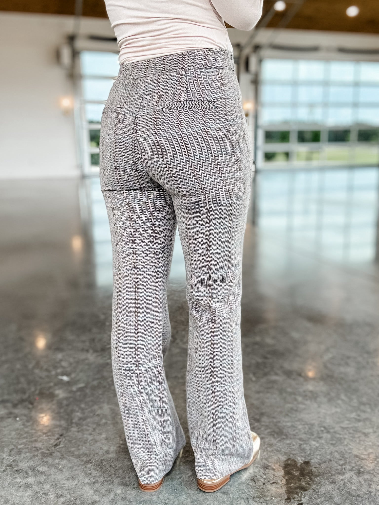 These Business Casual Bottoms feature a timeless herringbone pattern, a high waist for a flattering fit, and elegant flare pants. Perfect for adding a touch of sophistication to your professional wardrobe.