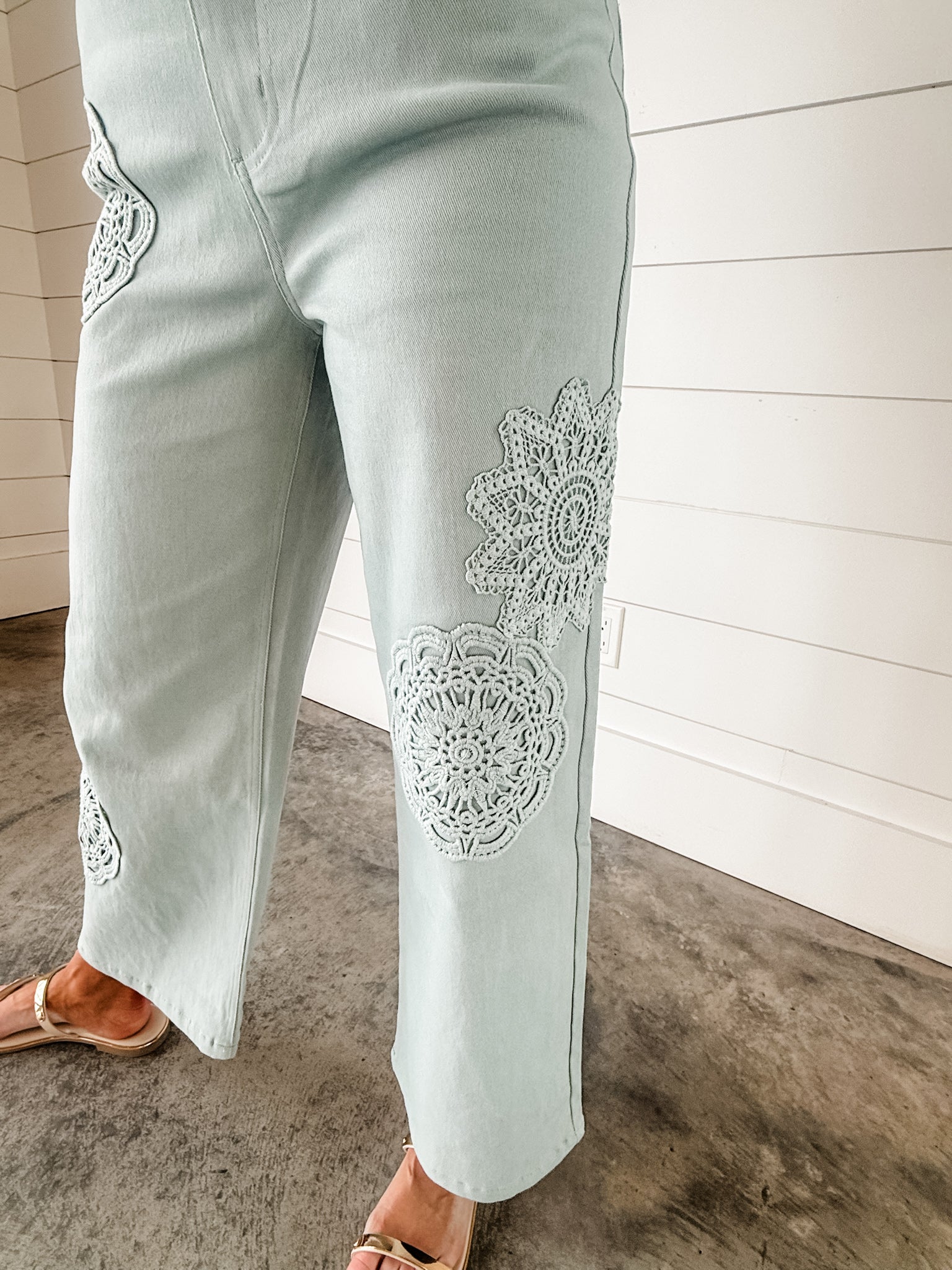 The Entro Taylor Jeans feature a distinct seafoam green color complemented by intricate flower embroidery. This combination not only enhances aesthetic appeal but also offers versatility in styling. The unique hue provides a contemporary alternative to traditional denim, making these jeans suitable for various casual occasions.