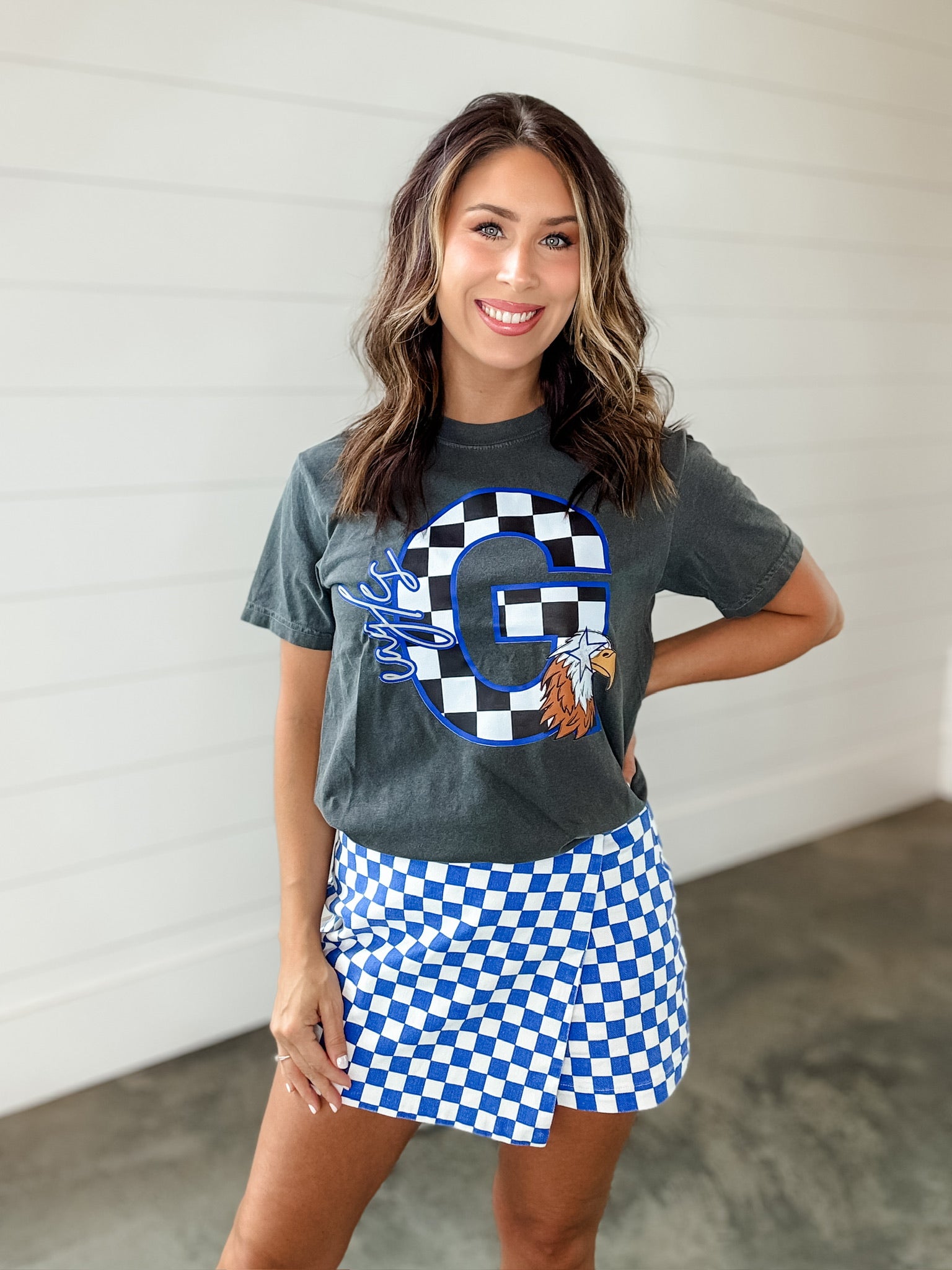Be the ultimate game-day fashionista with our Gameday Checkered Skort. Made with soft, breathable cotton knit fabric and treated with a bio-stoning enzyme wash, this skort combines comfort and style. The front wrap overlay adds a touch of sophistication, while the invisible zipper closure on the back ensures a perfect fit. With an inside short for added coverage, this mini skort is a must-have for any sports event.