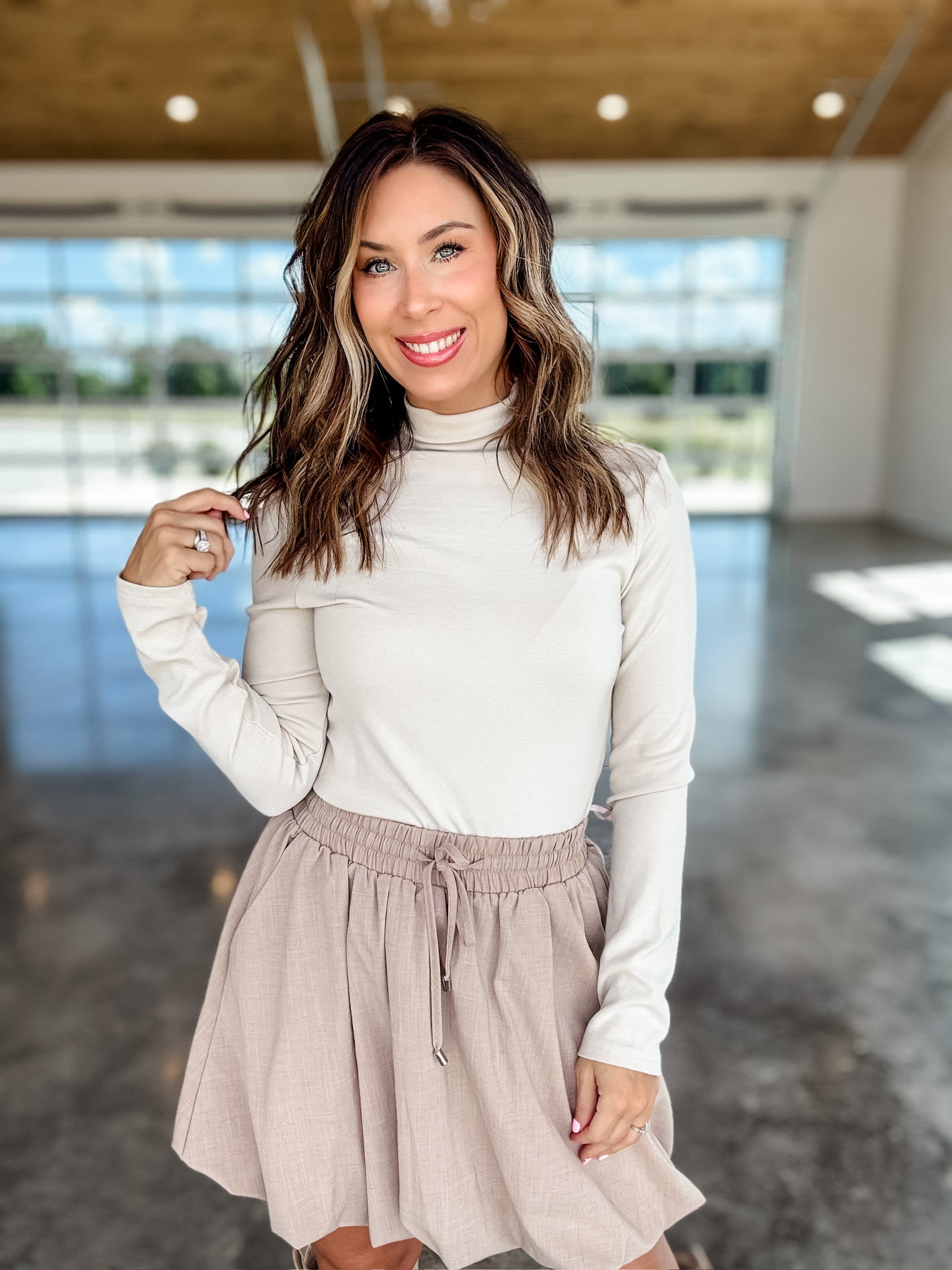 Expertly crafted from lightweight linen, this taupe bubble skirt offers both style and comfort. The flattering draw string waist accentuates your figure while the airy fabric keeps you cool on warm days. Upgrade your wardrobe with this versatile and sophisticated piece.