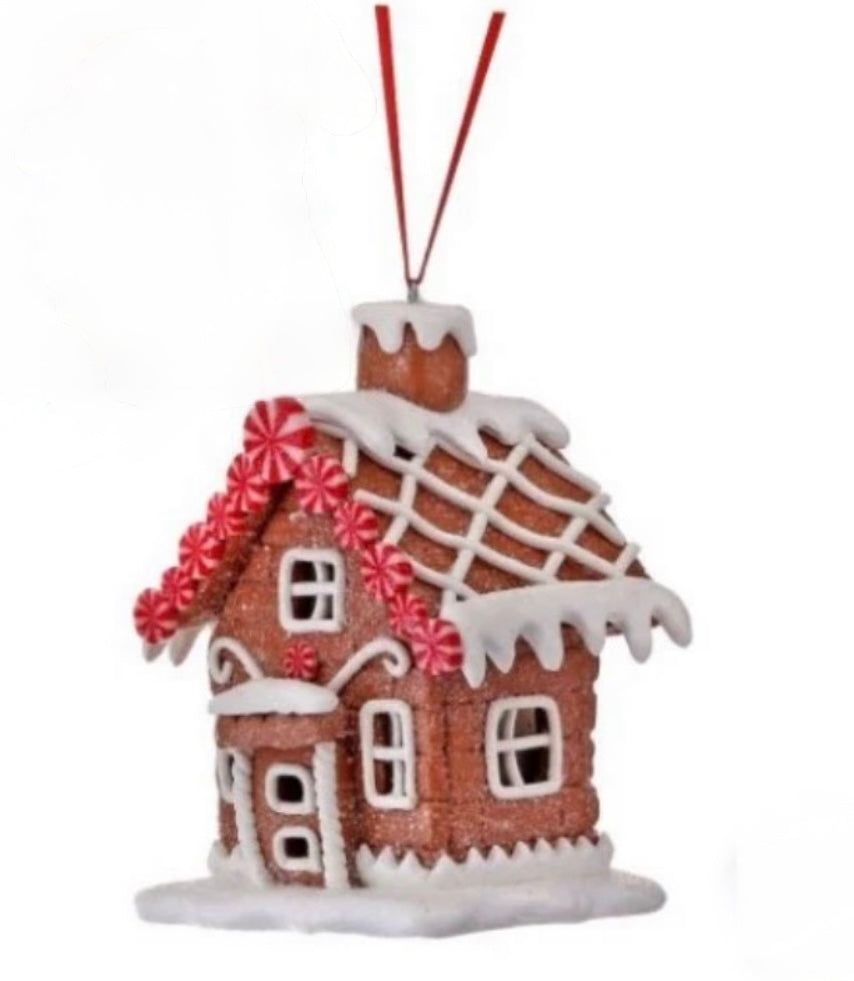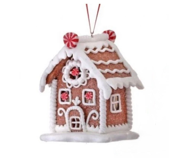 Crafted from durable claydough, this charming 4" Gingerbread House Ornament is sure to add a touch of festive cheer to your holiday decor. With its detailed design and festive peppermint accents, it's a must-have for any ornament collection. Bring the joy of the holidays into your home with this delightful addition.