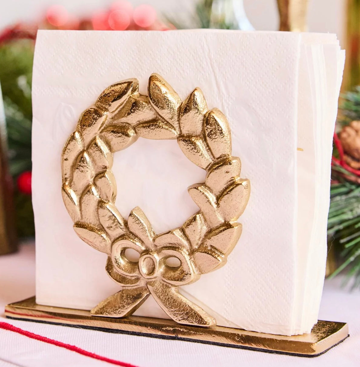 Introducing the Mary Square Wreath Napkin Holder, a beautiful and functional addition to your table setting. Crafted with a gold wreath design, this napkin holder adds a touch of elegance and sophistication to your dining experience. Perfect for everyday use or special occasions.