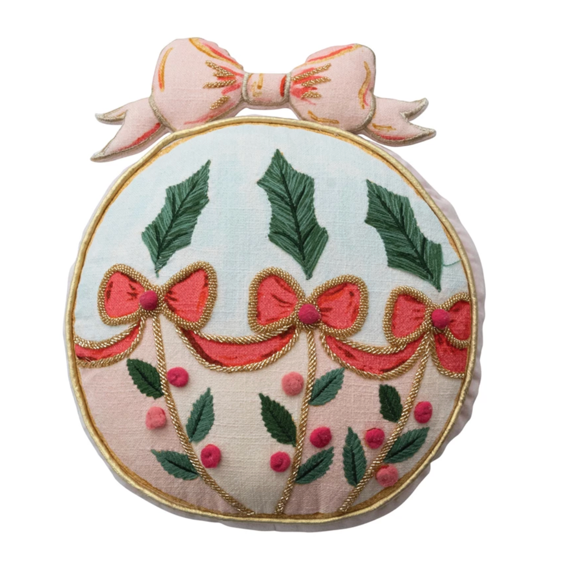 Add a touch of festive whimsy to the seasonal decor with this Slub Printed Ornament-Shaped Pillow. It features intricate embroidery, playful pom poms, holly, bows, and delicate beads in vibrant colors. Perfect for winter and Christmas settings, this charming pillow effortlessly combines aesthetics with functionality, creating a cozy and joyful atmosphere. It's ideal for placing on sofas, armchairs, or beds, enhancing the holiday spirit in any room. Made with a soft and durable cotton cover and filled with polyester for plush support, this pillow measures 15 inches in length and 12 inches in width, making it a delightful addition to any home.