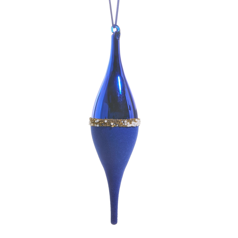 Enhance your holiday decor with the RAZ 10" Blue Pearl Banded Velvet Finial Ornament. The beautiful blue color and pearl banded design make it a perfect addition to any Christmas tree or festive display. Made from high-quality materials, this ornament is sure to add a touch of elegance to your seasonal decorations.