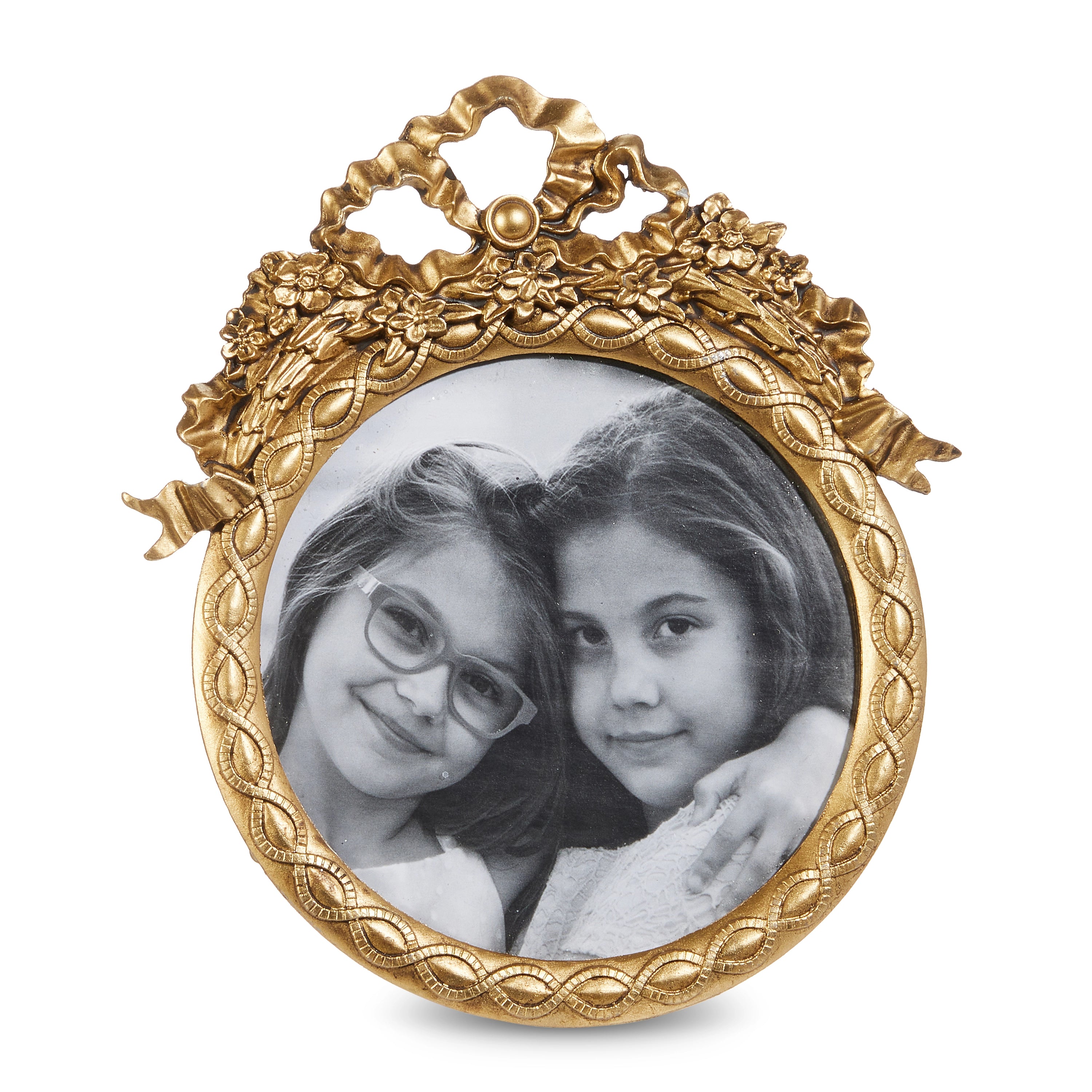 This RAZ 7" Bow Picture Frame features a beautiful gold bow frame, adding a touch of elegance to any photo displayed. Crafted with precision and attention to detail, this frame is a perfect addition to your home decor. Show off your memories in style with this stunning frame.