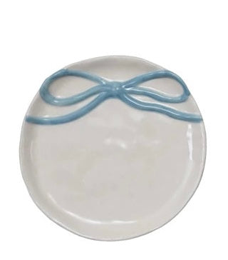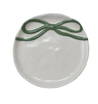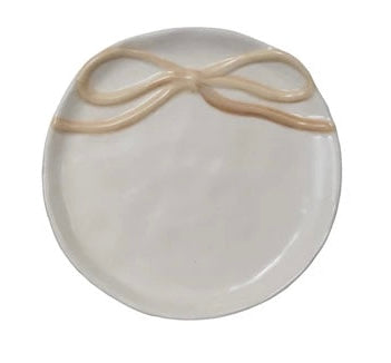 Enhance your tabletop presentation with our Round Stoneware Dish with Bow. Crafted from high-quality stoneware, this round tray features a delicate bow design, adding an elegant touch to any dish. Perfect for serving small bites or as a decorative piece, the possibilities are endless with this versatile tray.
