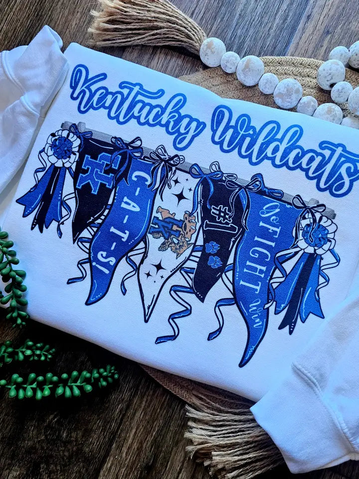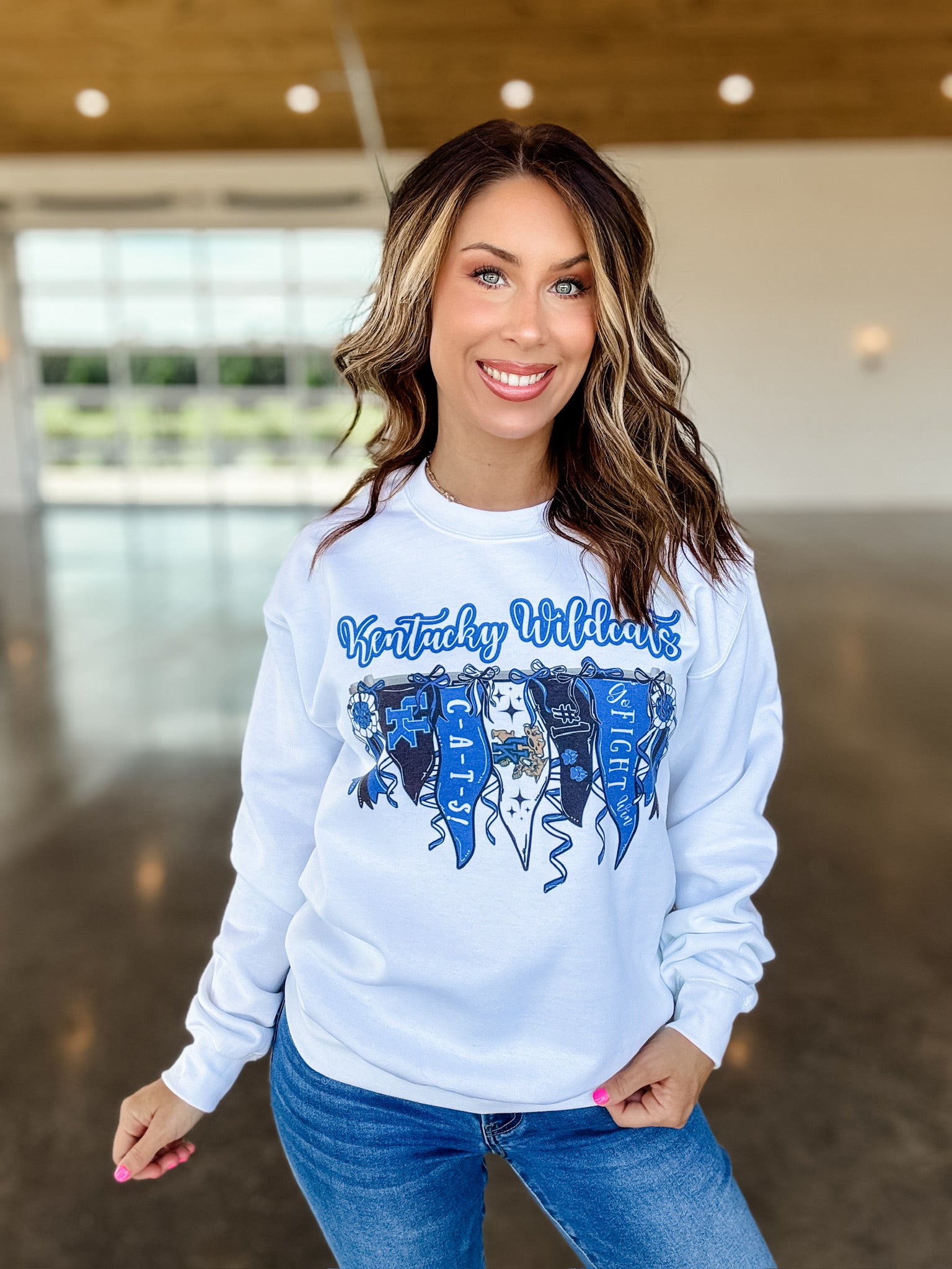 This cream-colored Kentucky Pennant Flag Gildan Sweatshirt features a comfortable crewneck design. With its cozy and stylish design, this sweatshirt is perfect for showing off your state pride, whether you're cheering on your favorite sports team or just staying warm on a chilly day. Represent the Bluegrass State in style with this versatile and stylish sweatshirt.