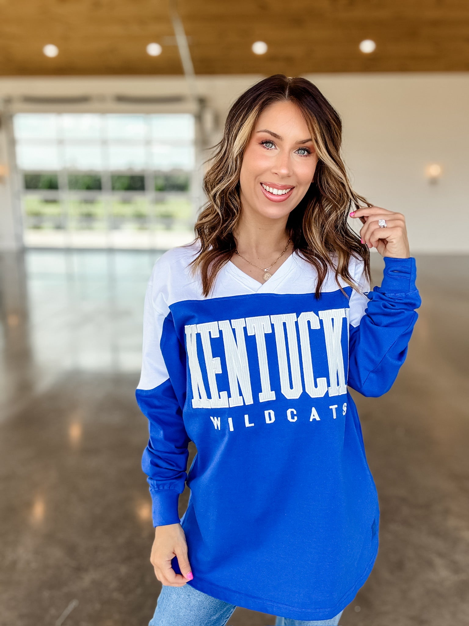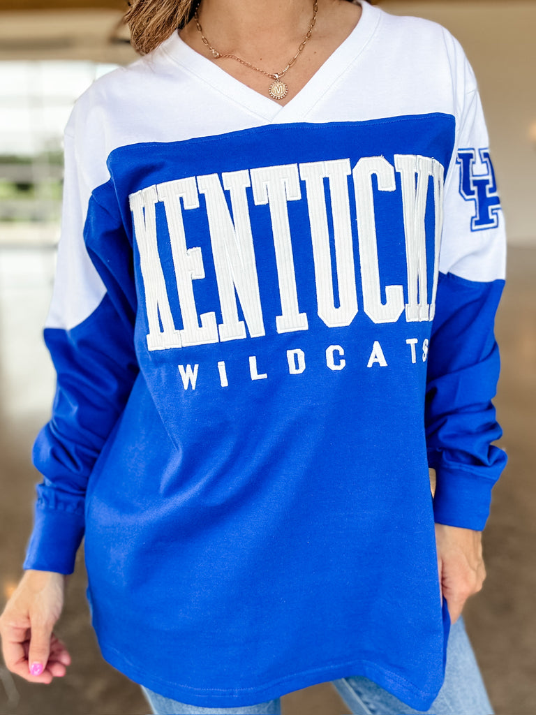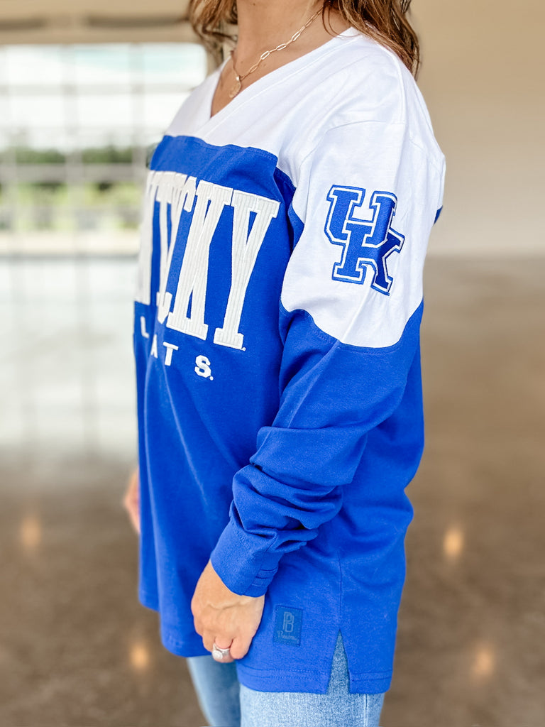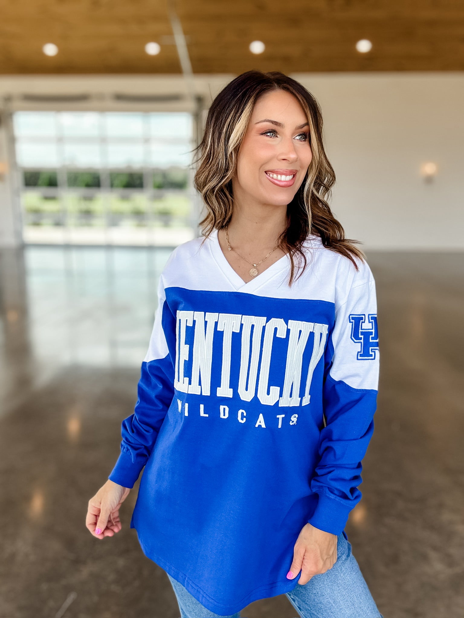 Elevate your casual wardrobe with our Kentucky Victory Oversized Jersey Tee. This luxurious long sleeve V-neck tee features the iconic UK logo on the shoulder, proudly showing your support for the prestigious UK team. The blue and white color palette adds a touch of sophistication to any outfit.