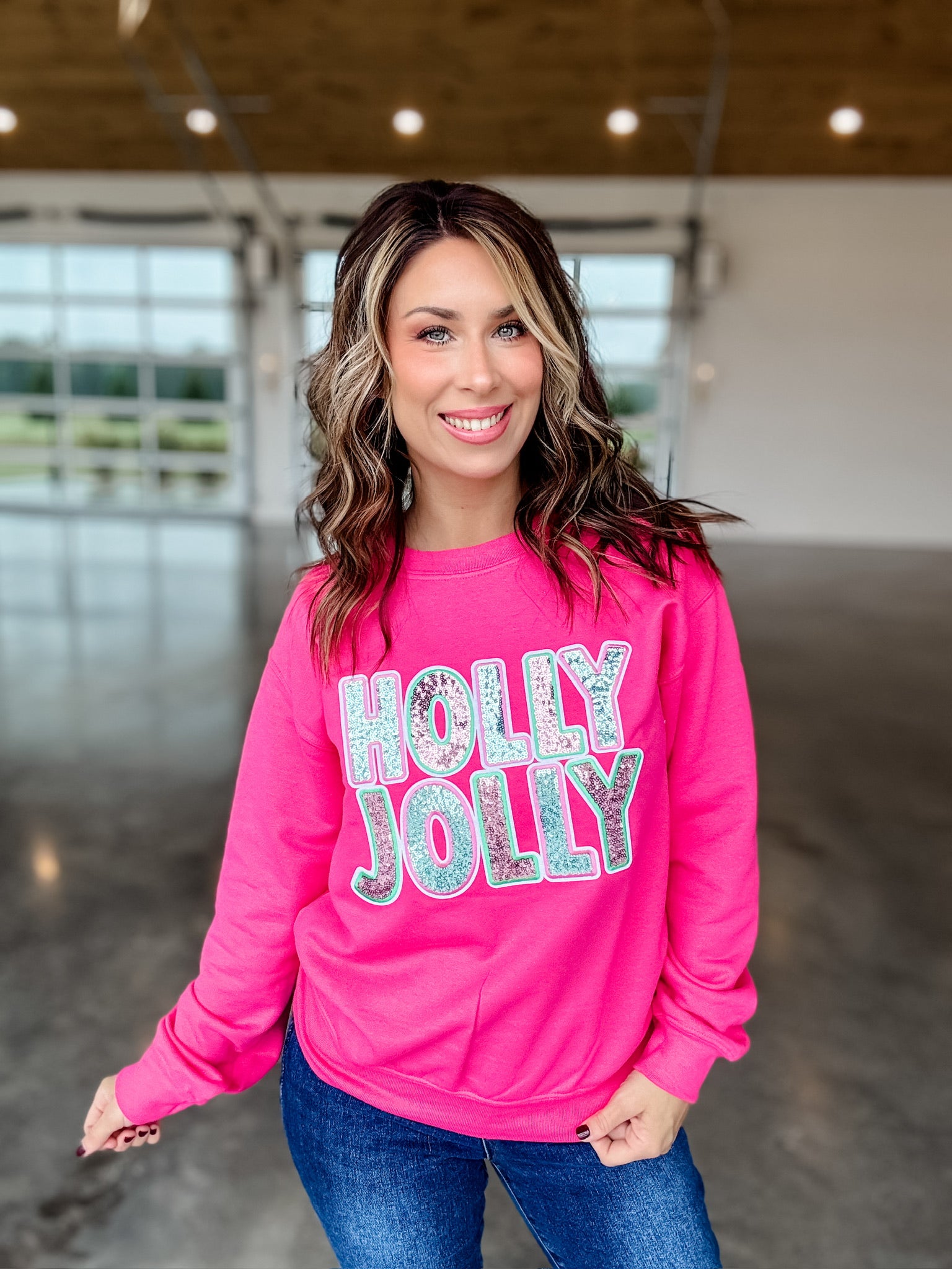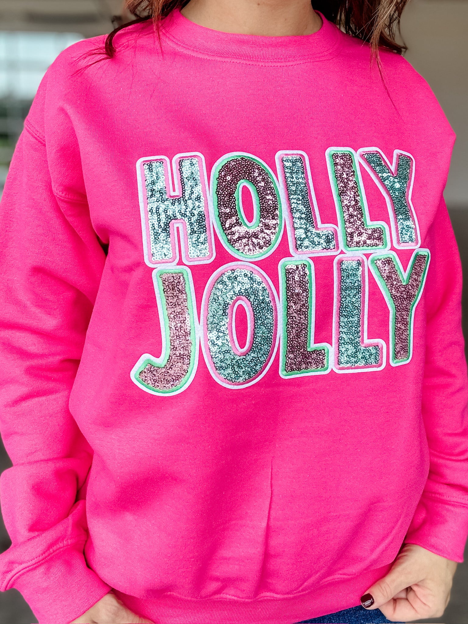 Get ready to sparkle and spread holiday cheer with our Sequin Holly Jolly Sweatshirt! Featuring a real sequin patch, this sweatshirt is the perfect addition to your festive wardrobe. Perfect for adding a touch of holiday fun to any outfit.