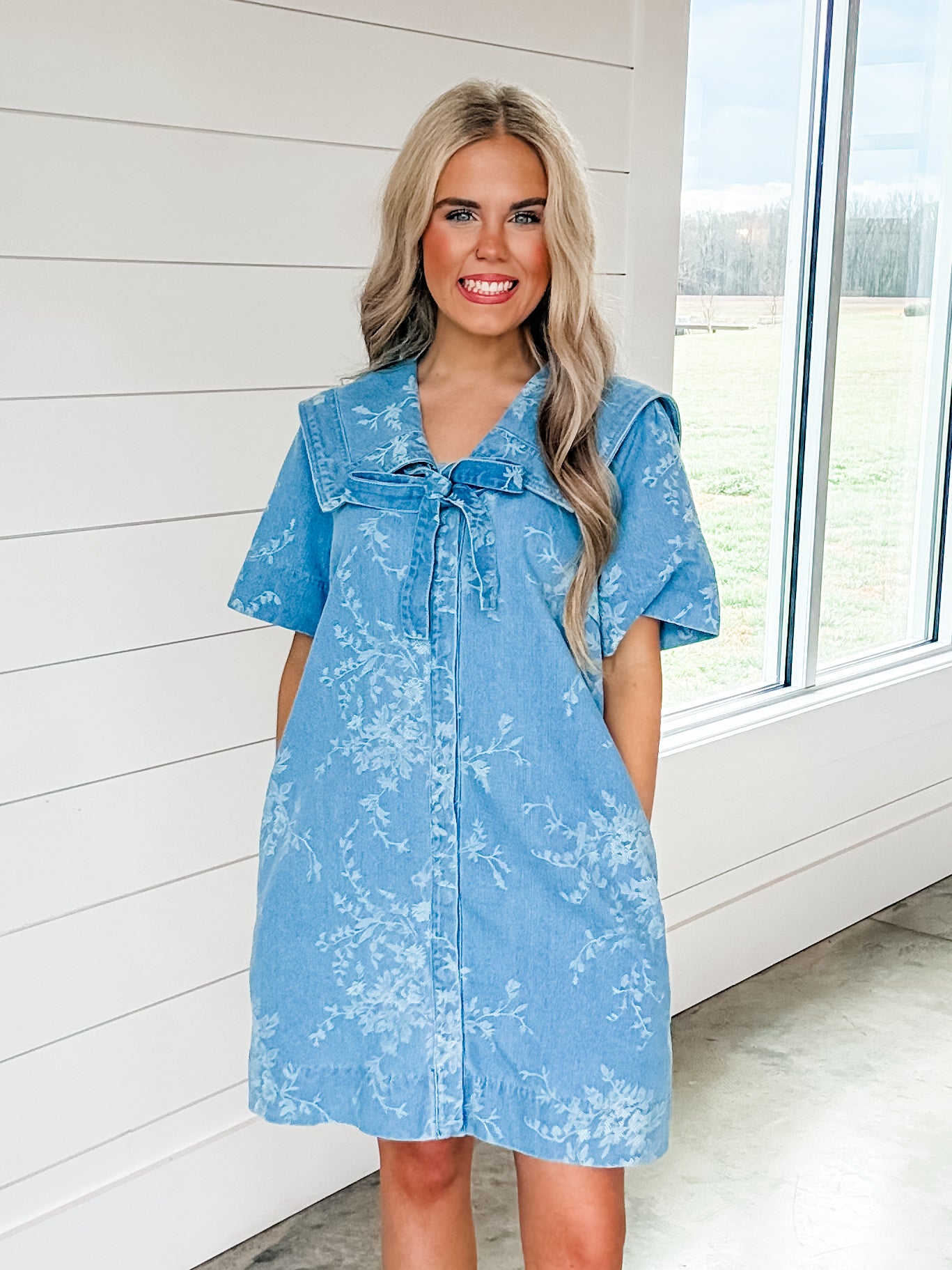 The Darlin Dream Dress features an elegant denim fabric adorned with intricate floral embroidery, enhancing its aesthetic appeal. The sailor collar adds a classic touch, providing structure and sophistication. This dress is suitable for various occasions, combining comfort with a unique style.