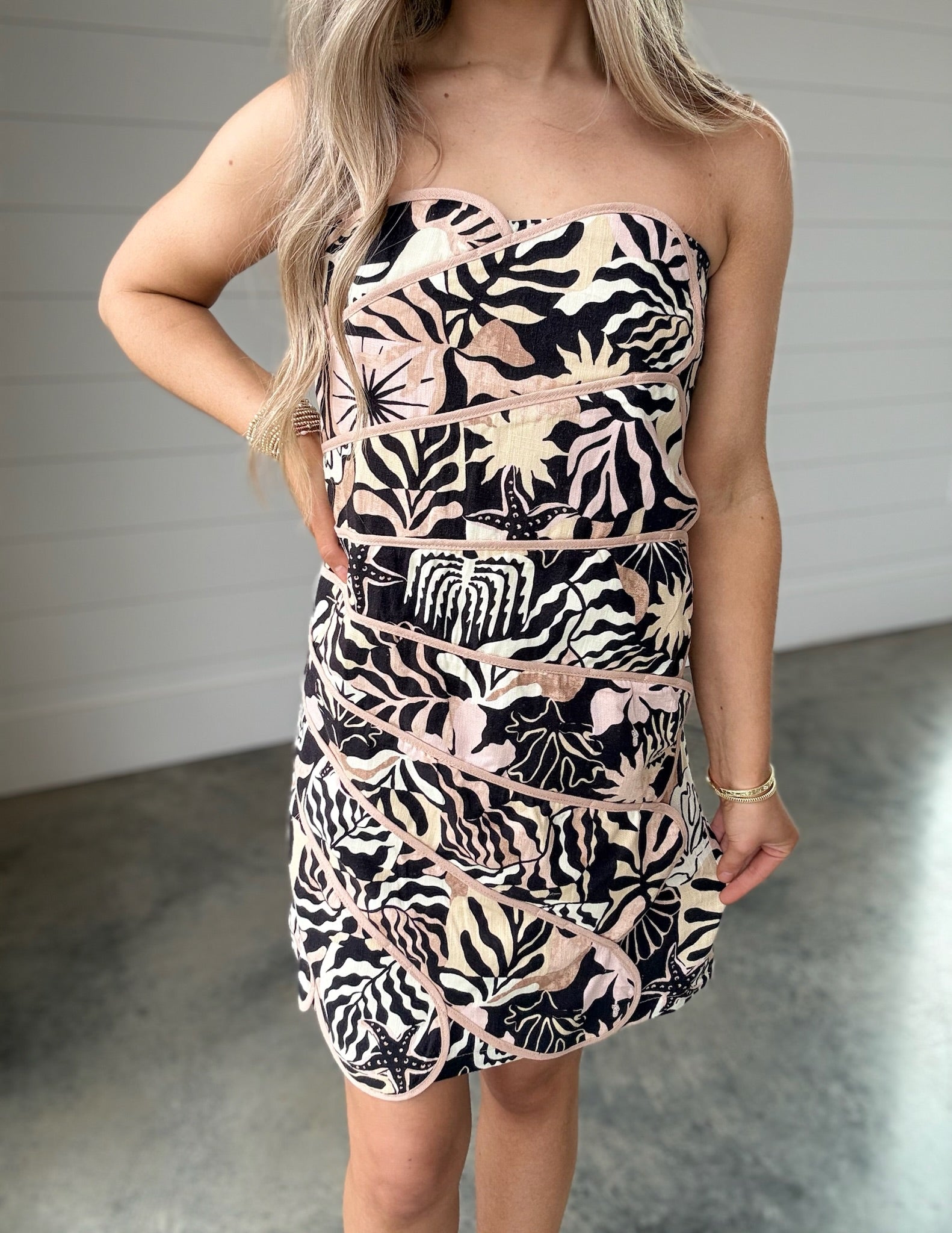 The Coastal Bloom Mini Dress features a tropical-inspired print and a linen blend composition, enhancing breathability and comfort. Its scalloped layering provides a distinct aesthetic while maintaining a lightweight feel. This dress is designed for casual wear, making it suitable for warm weather conditions.
