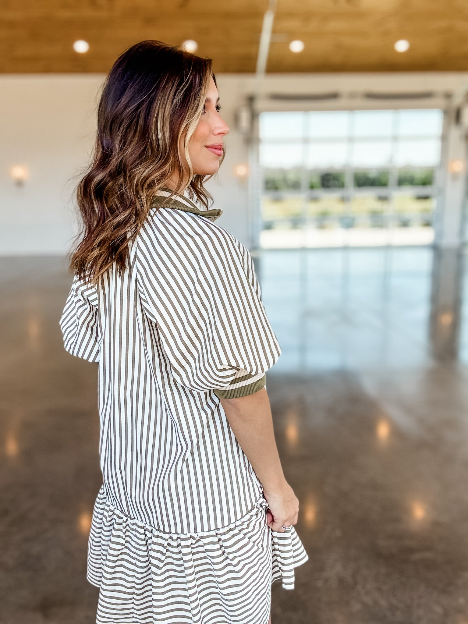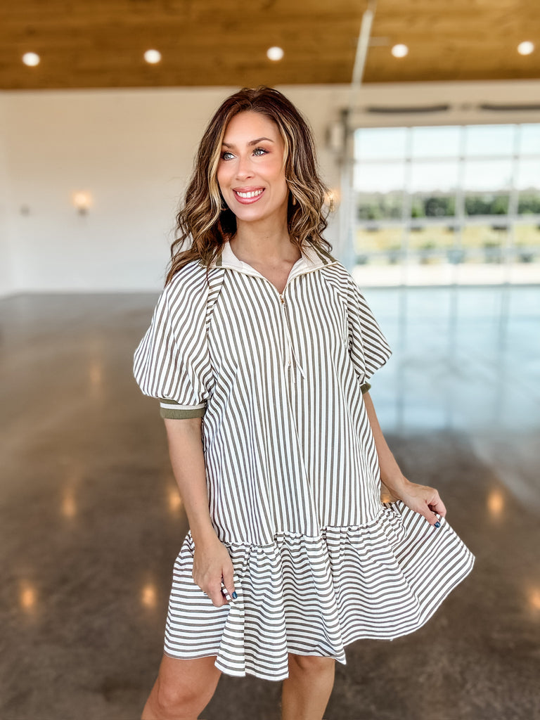 This Olive Striped Mini Dress offers timeless sophistication and effortless style with its classic olive green and cream stripes. Crafted with quality and comfort in mind, this mini dress is a versatile addition to any wardrobe. Elevate your look with this must-have dress.