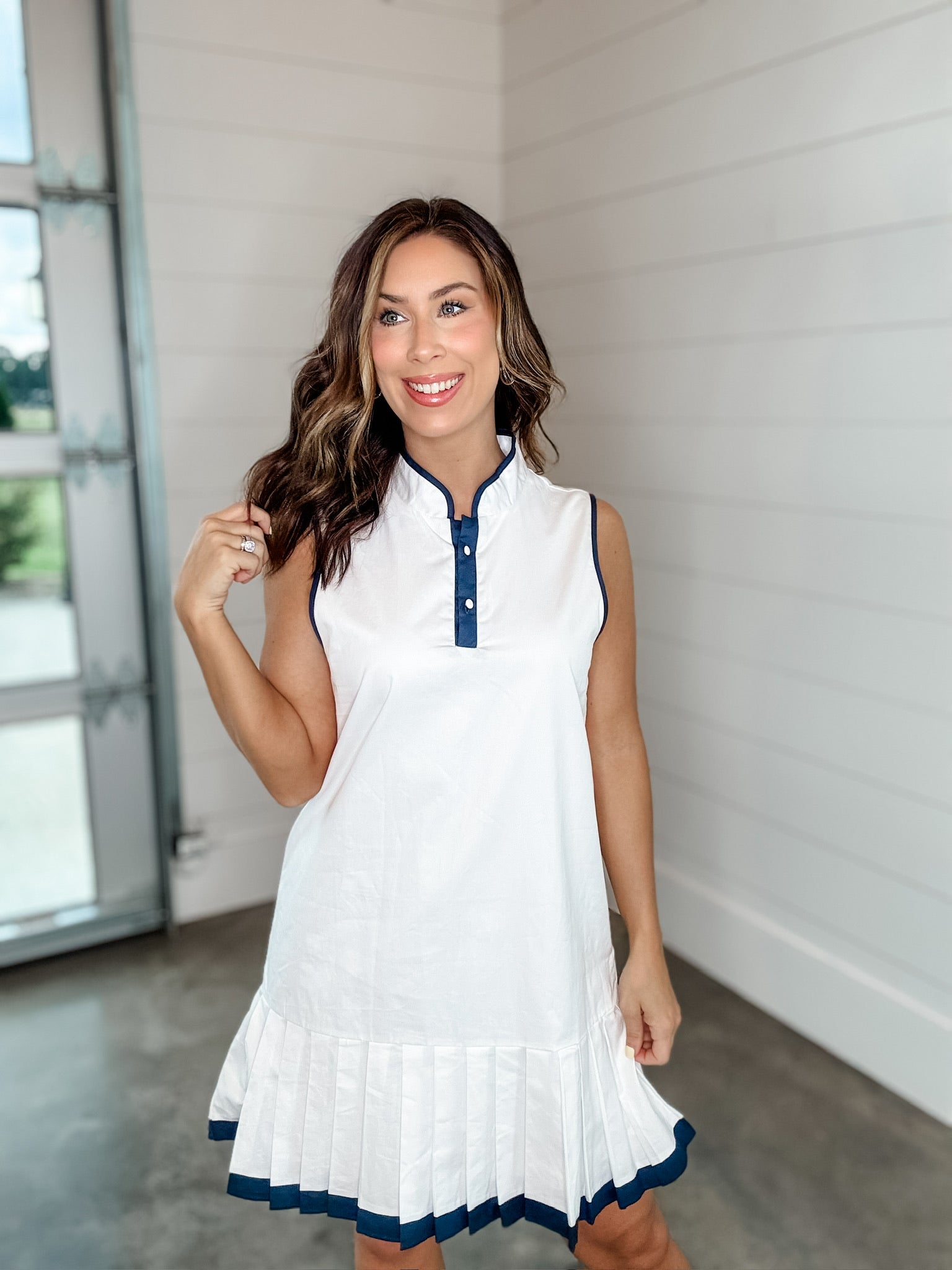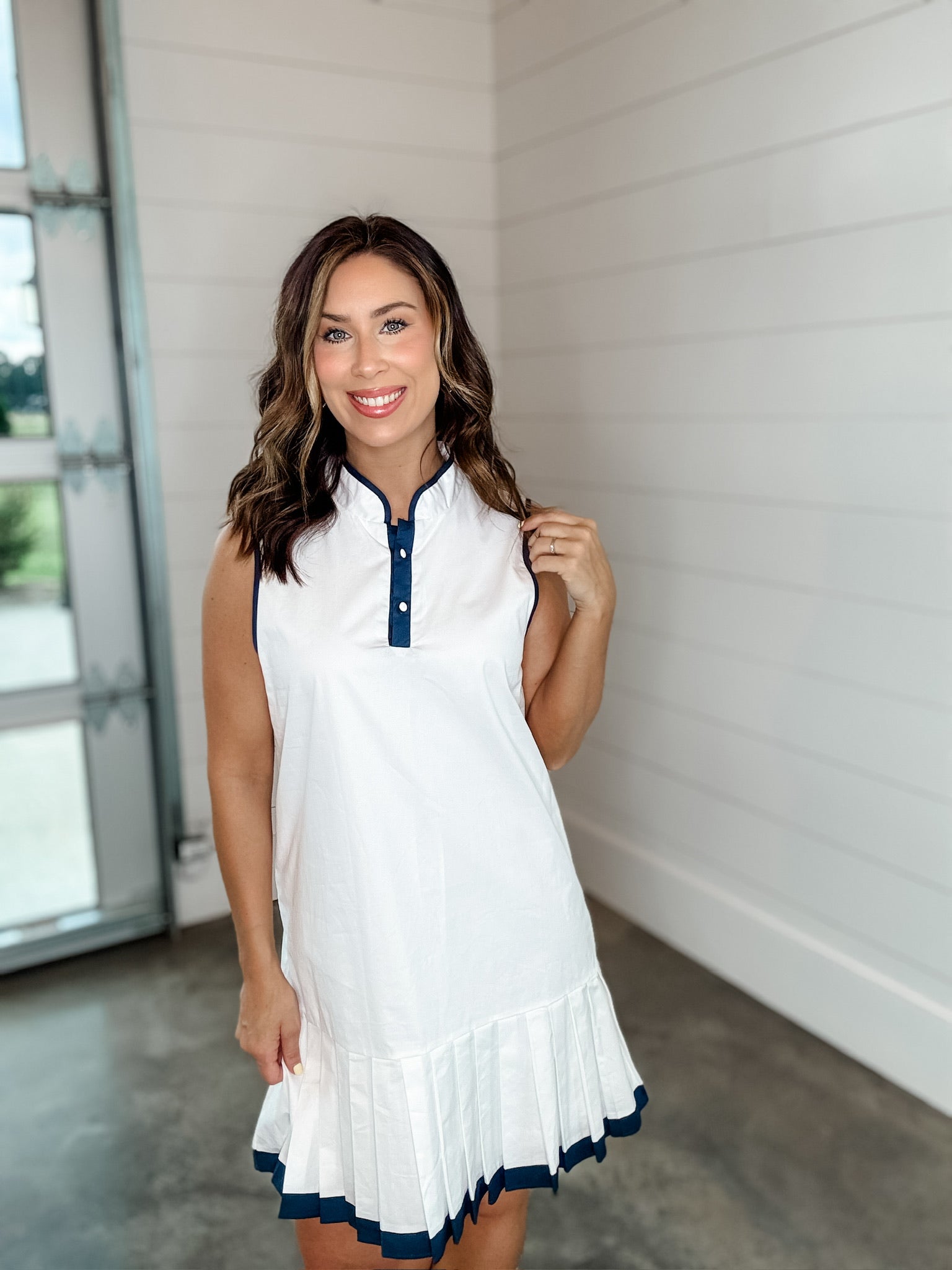 The Sailing Away Dress is the perfect addition to any wardrobe. This white, short sleeve dress features a navy button up and soft navy lining, providing a crisp and stylish look. Made with high-quality materials, this dress offers comfort and durability, making it a must-have for any occasion.