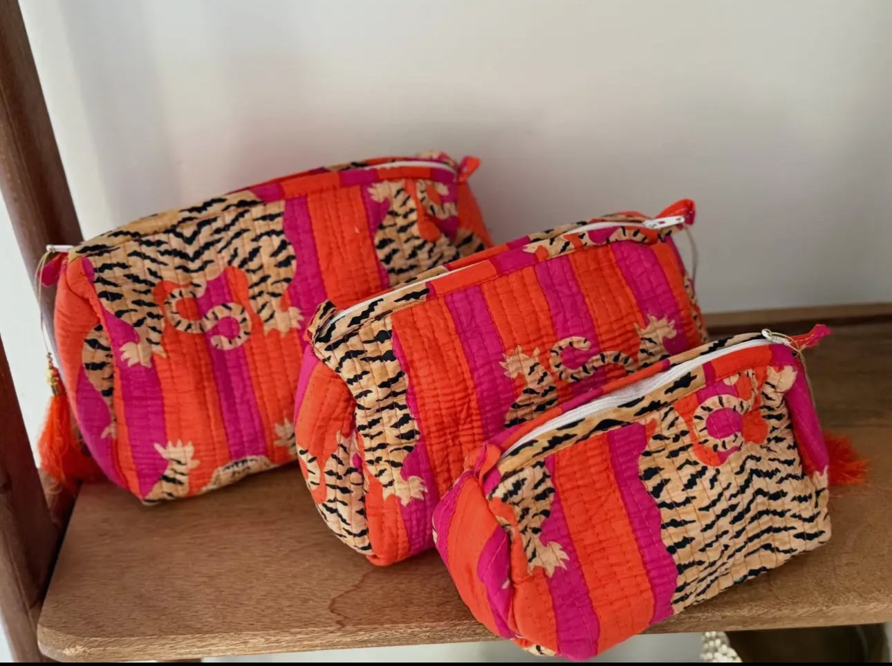 The Safari Lover Cosmetic Bags feature a vibrant red and hot pink striped quilted design adorned with tiger motifs. This combination not only enhances aesthetic appeal but also ensures durability and protection for your cosmetics. The quilted texture provides a padded interior.