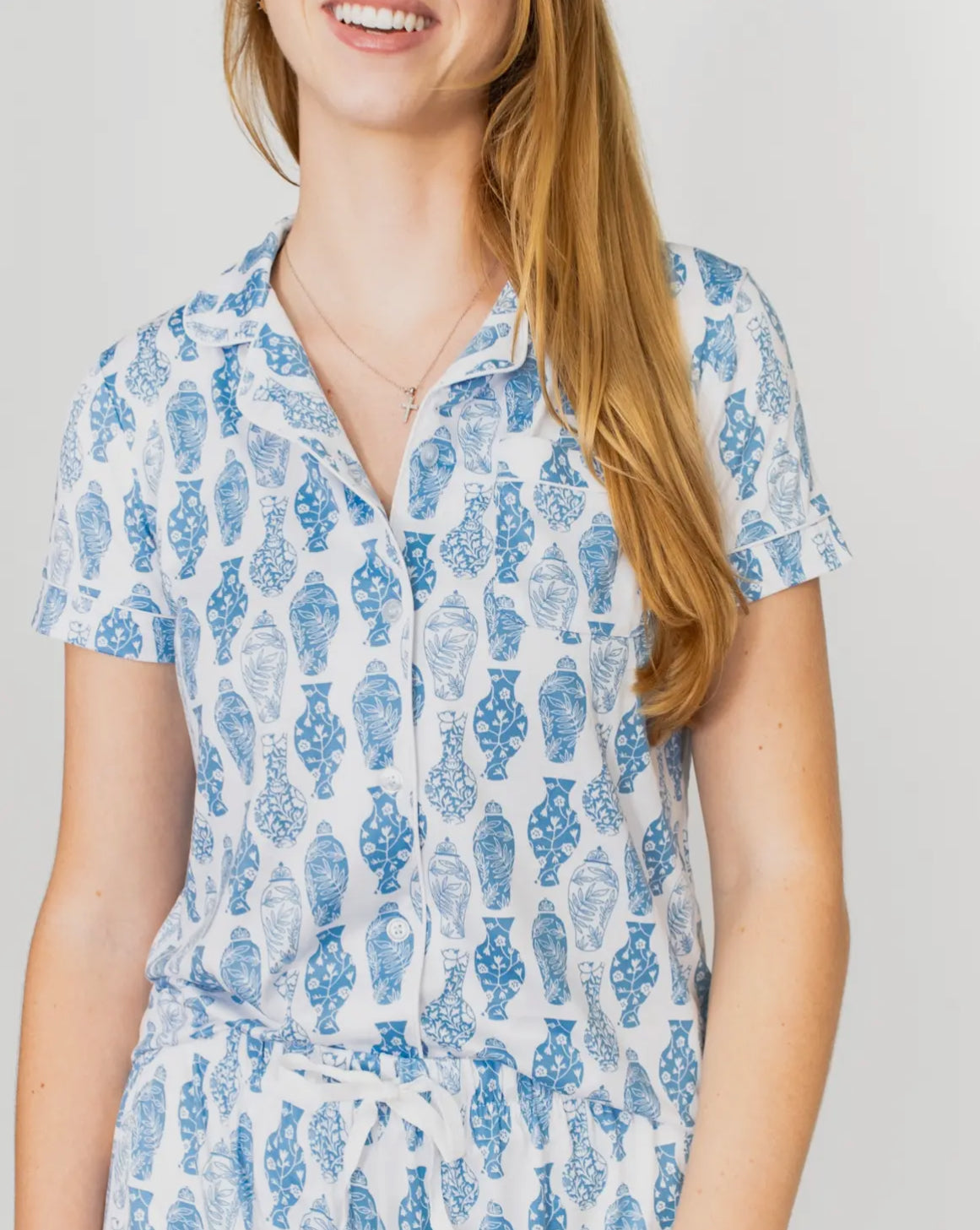 Expertly designed for ultimate comfort, the Claire Short Sleeve Pajama Top will become your go-to relaxation essential. Made with soft, high-quality fabric and featuring a stylish blue pots design, these pajamas are both comfortable and eye-catching. Pair with the matching pants for a complete loungewear set.