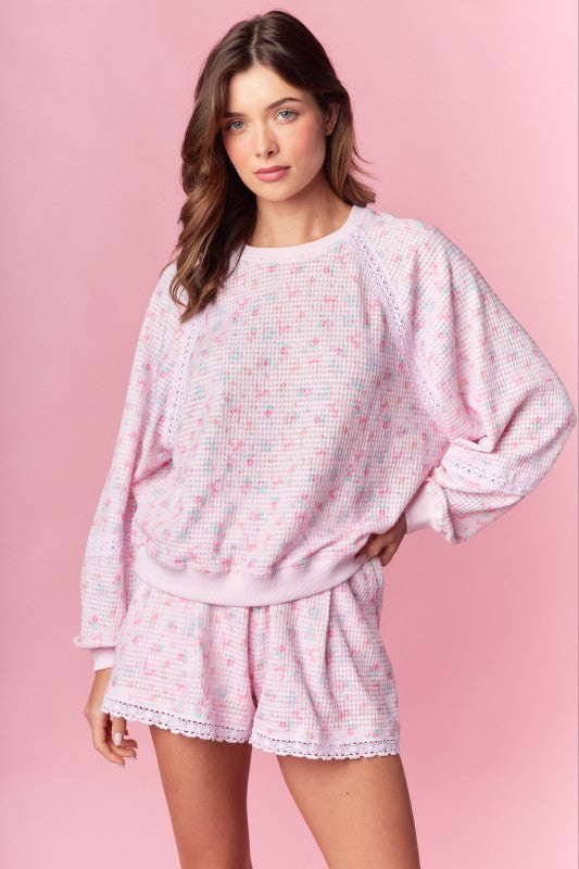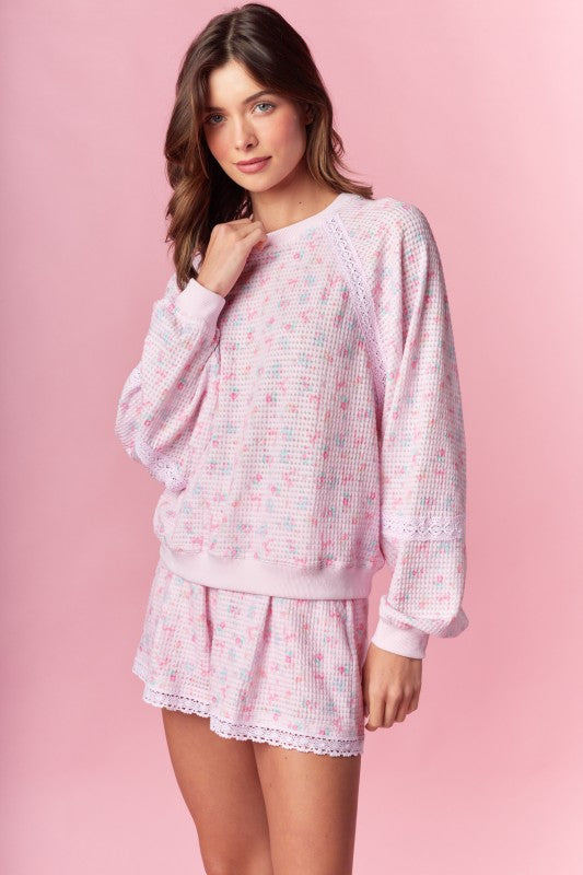 Designed for the stylish trendsetter, our Ditsy Girly Pastel Long Sleeve Top combines delicate pastel florals with adorable pink bows. Made from waffle knit material, this top offers both comfort and fashion-forward style. Elevate any outfit with this charming and versatile piece.