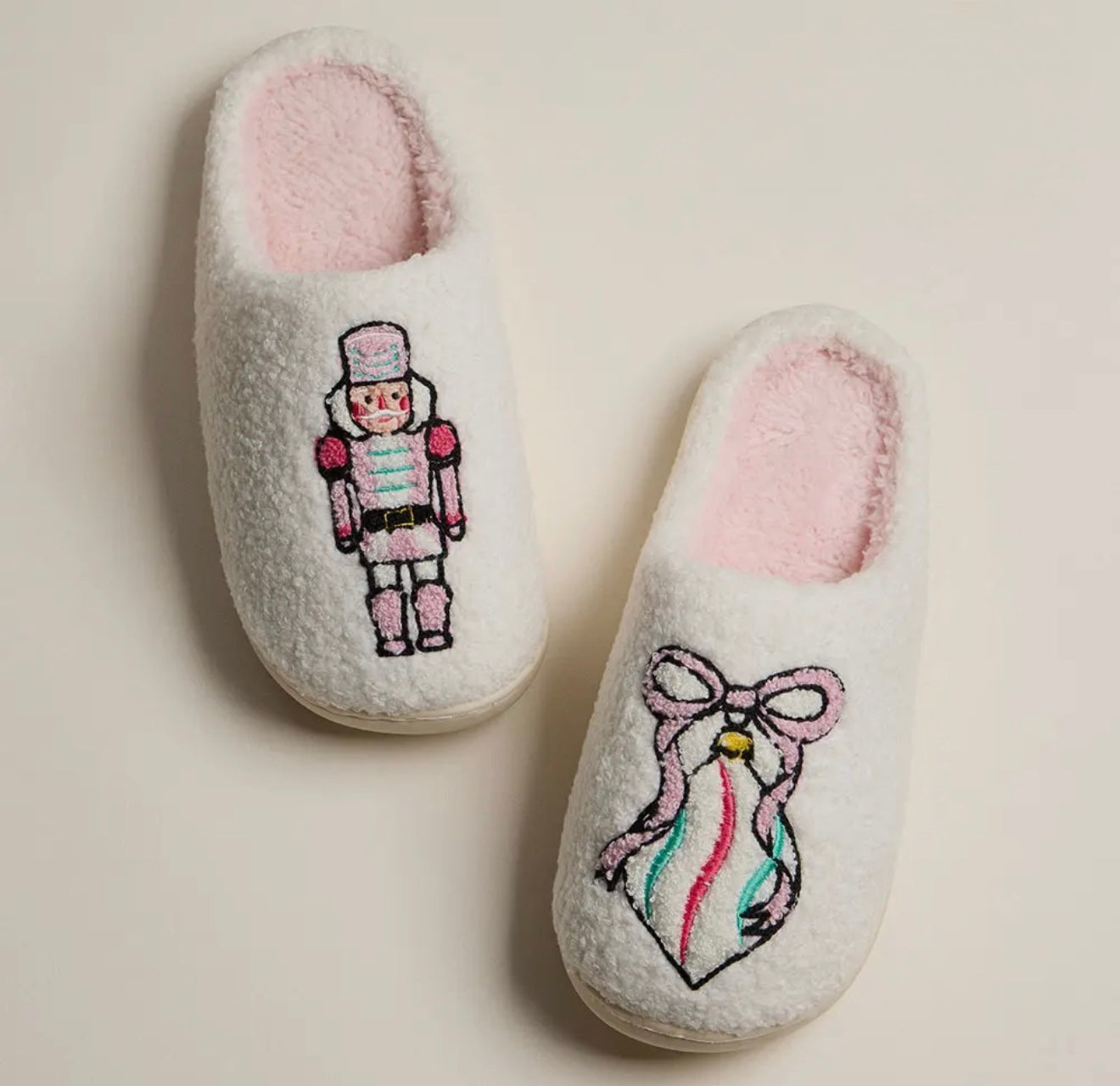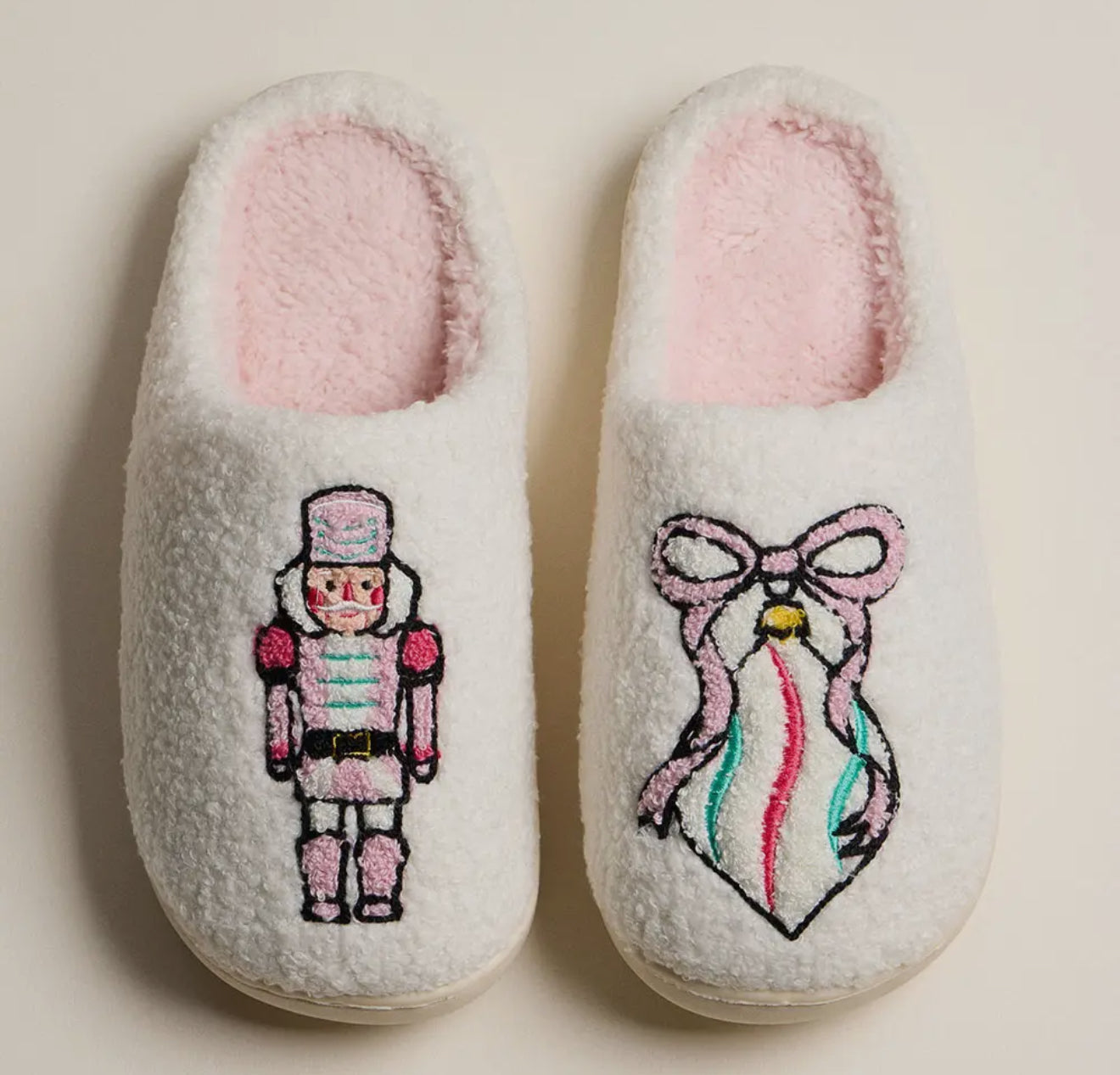Indulge in cozy comfort this holiday season with our Girly Christmas Fuzzy Slippers. Featuring a charming Nutcracker and bow ornament, these soft house slippers will keep your feet warm and festive. Perfect for gifting or treating yourself.
