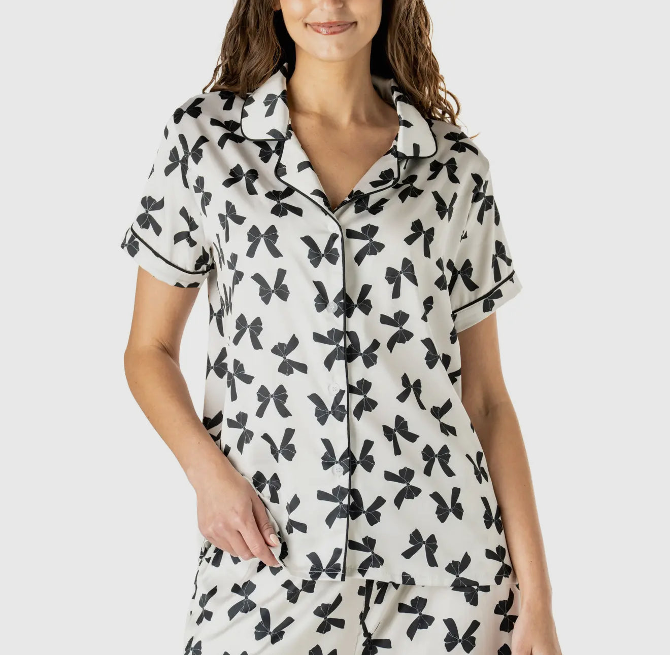 Introducing Hello Mello Bow Satin Top, the perfect combination of elegance and comfort. Made with white satin, this pajama top features black bows for a touch of sophistication. You'll love how the soft fabric feels against your skin, making it the ideal choice for a cozy night's sleep.