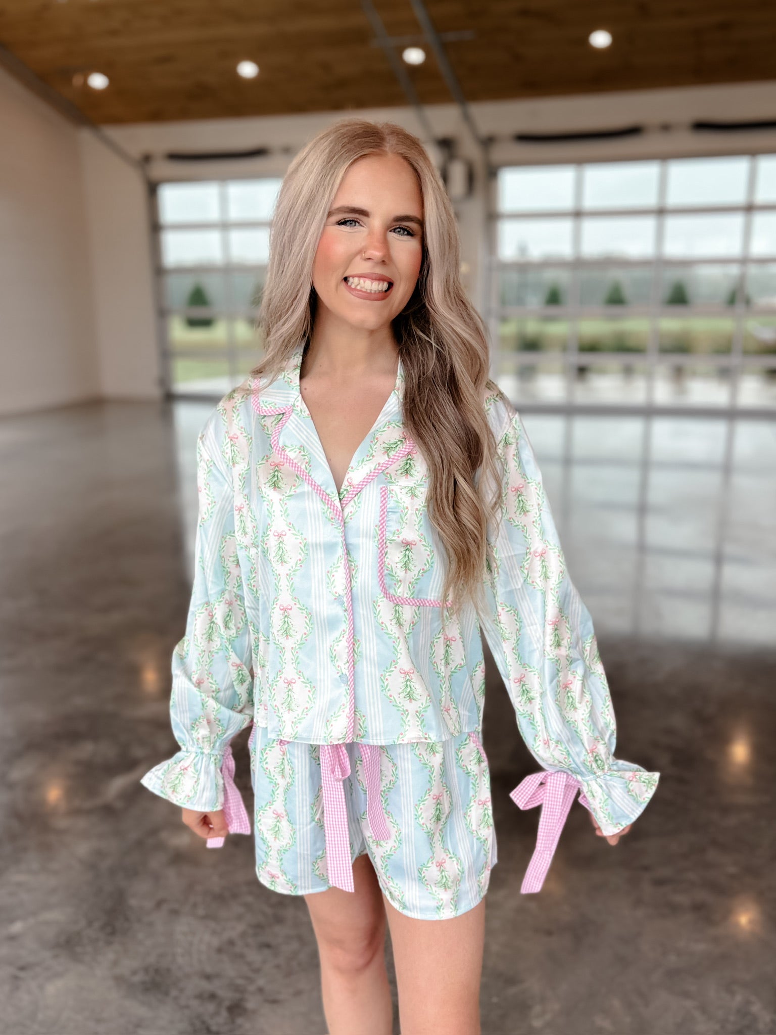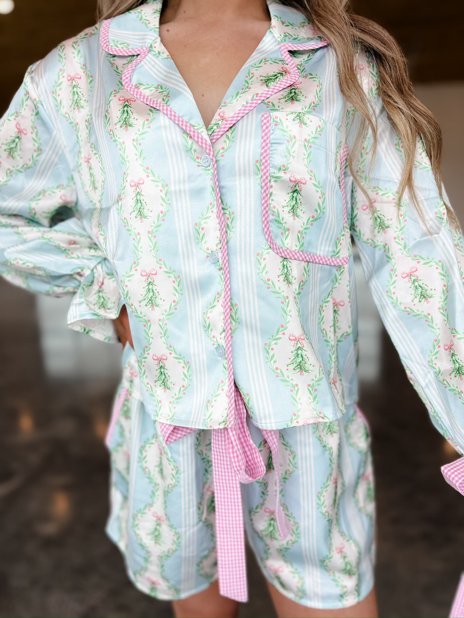 This Christmas satin sleep top features a playful combination of blue stripes, green vines, and Christmas trees adorned with pink bows. The pink gingham outline and bow tie accents on the long sleeves add a touch of girly charm. Stay stylish and comfortable while getting your beauty sleep.