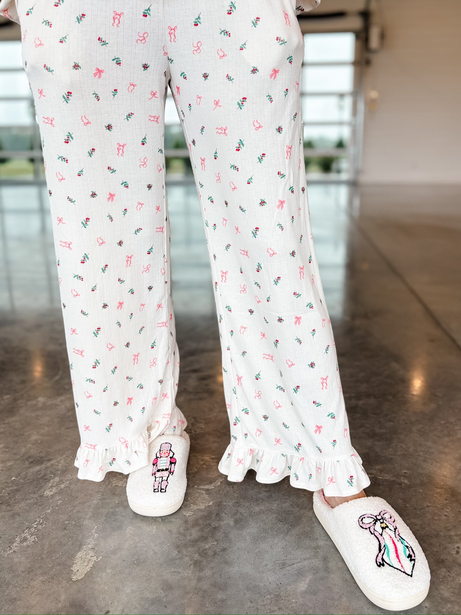 This soft cream pajama pants is adorned with festive red bows and mistletoe leaves, perfect for cozy holiday sleepwear. Stay comfortable and chic this season with our Under The Mistletoe Sleep Pants.