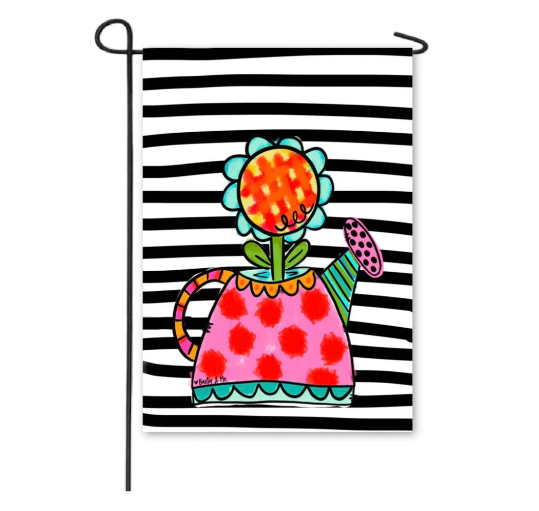 Enhance your outdoor space with the Funky Flower Can Striped Garden Flag. Featuring a vibrant flower design atop a black and white striped background, this flag combines artistic expression with a durable construction. Its fade-resistant materials ensure longevity, providing an eye-catching display for your garden throughout the seasons.