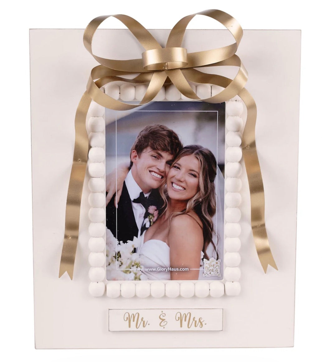 Commemorate a special day or cherish your favorite couple photo with the Mr. & Mrs. Gold Bow Frame! Featuring elegant lettering and a shimmering gold bow accent, this frame adds a sophisticated and romantic touch to wedding décor, anniversary displays, or newlywed keepsakes. Perfect for mantels, bedside tables, or gift-giving, it captures the beauty of love and commitment in timeless style. A perfect gift for weddings, anniversaries, or bridal showers.