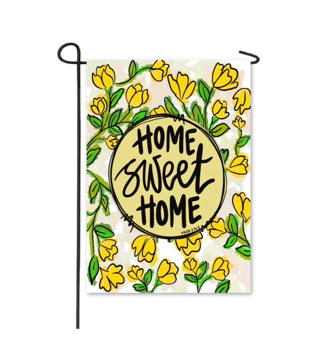The Yellow Floral Home Sweet Home garden flag features a vibrant yellow floral design, enhancing curb appeal while conveying a welcoming message. This durable sign is constructed for outdoor use, ensuring visibility and elegance. Its dimensions are suitable for various garden sizes, making it an effective decorative element for any home.
