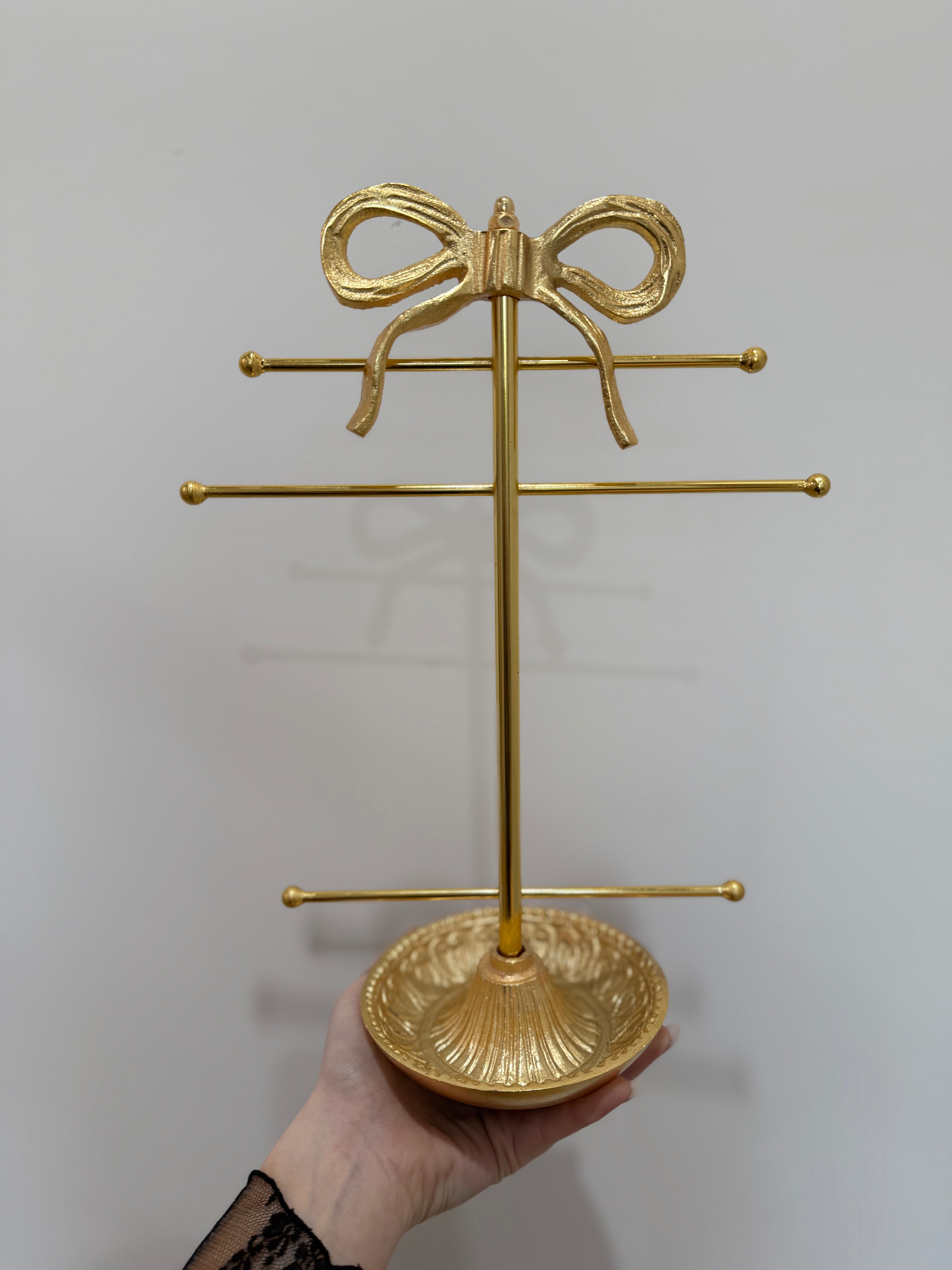 Display your precious jewelry with elegance and style using our Bow Jewelry Stand. Made from gold, this stand features a beautiful bow top that adds a touch of sophistication to your vanity or dresser. Keep your favorite accessories neatly organized and within easy reach.