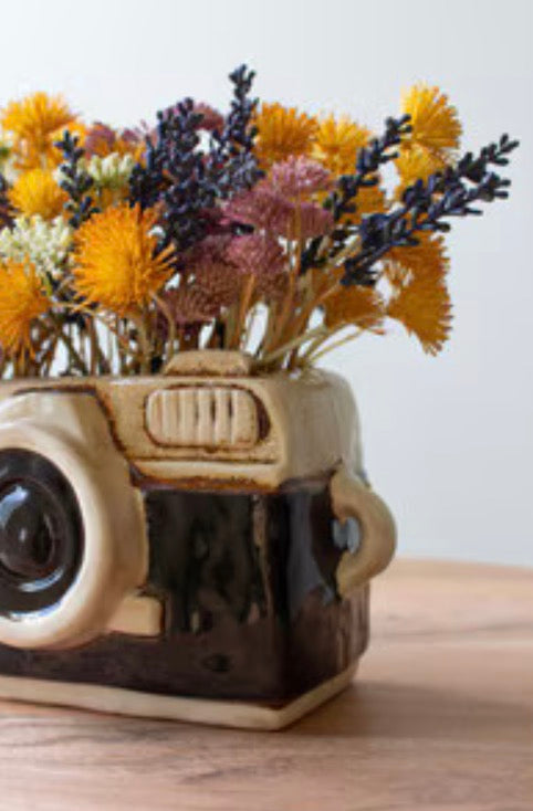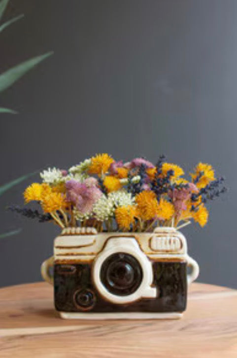 Shutterbugs will love this ceramic camera planter. Use it for pencils, blooms, or other items atop a desk or bookshelf for the perfect shot. This vintage-style black and white camera planter makes a great gift.