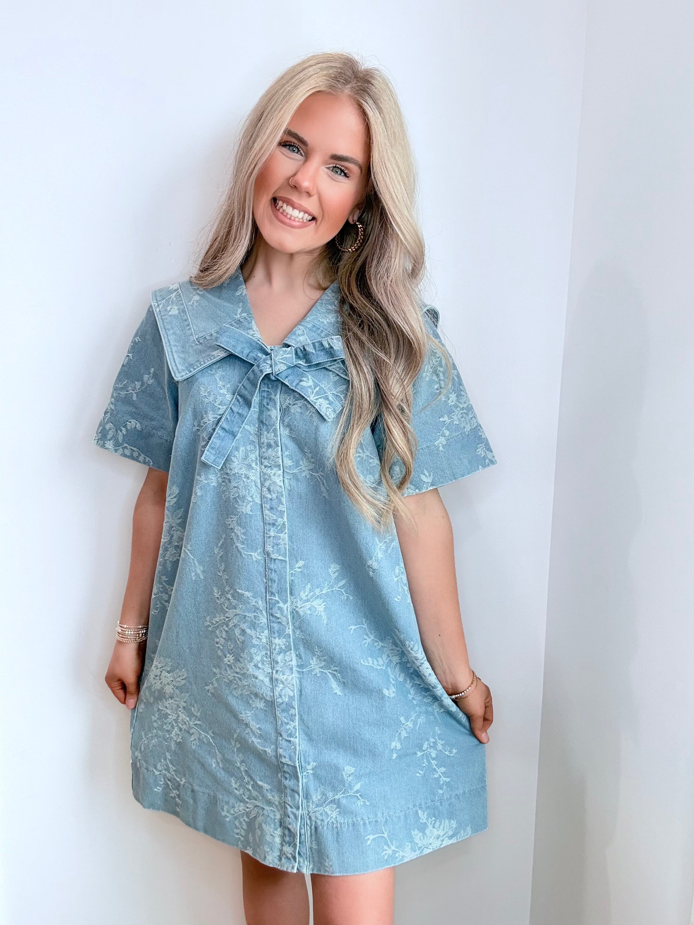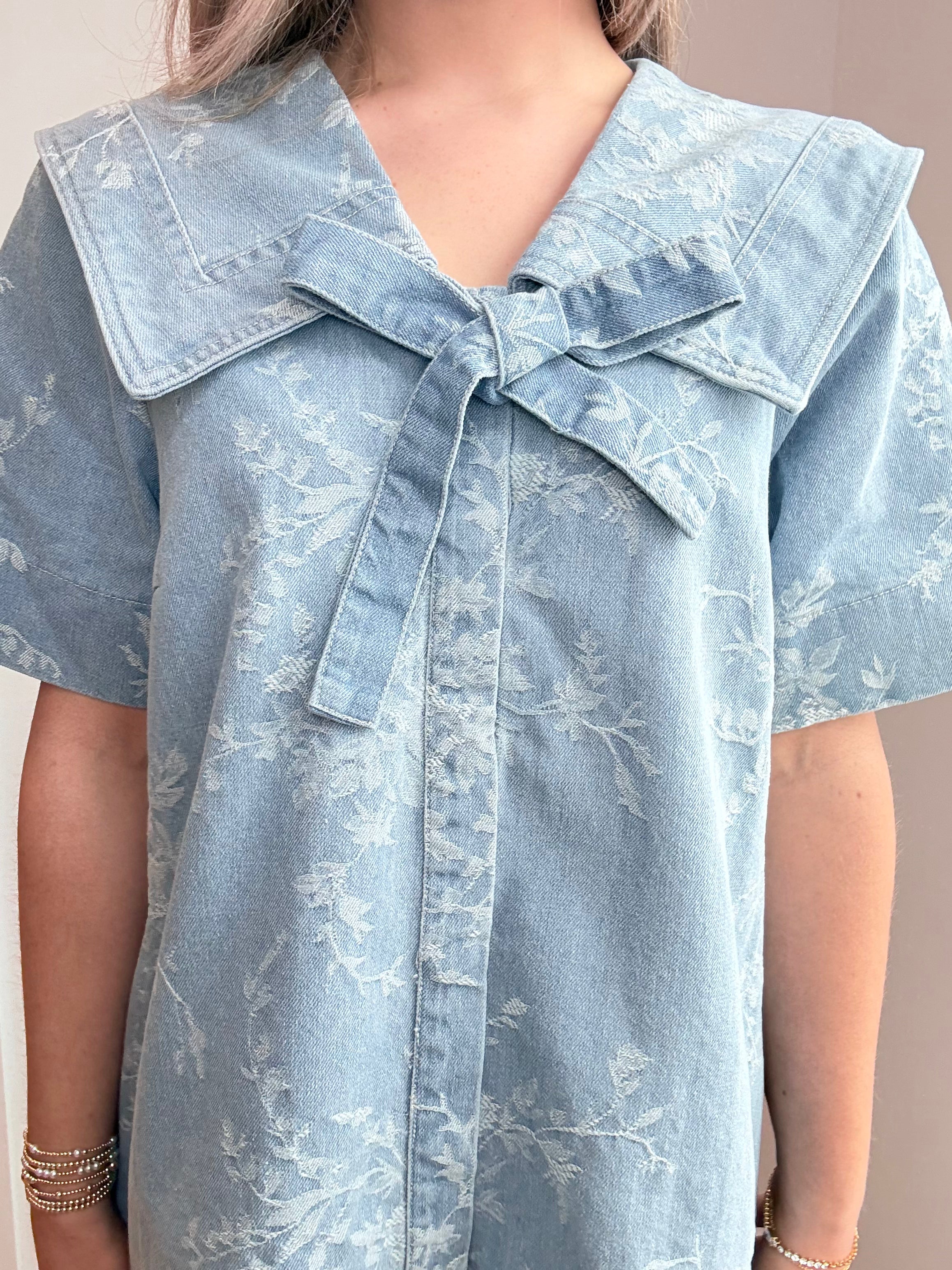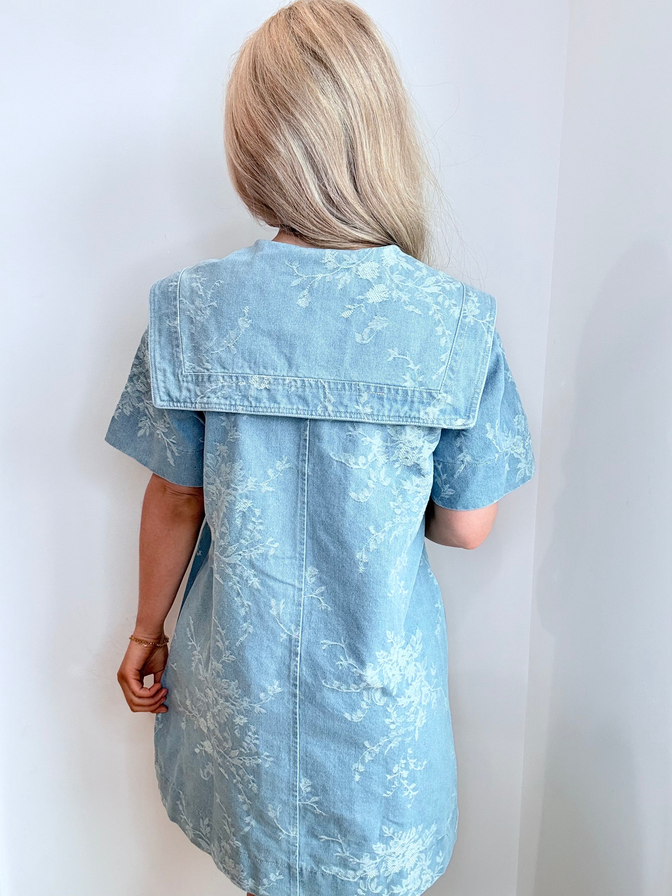 The Darlin Dream Dress features an elegant denim fabric adorned with intricate floral embroidery, enhancing its aesthetic appeal. The sailor collar adds a classic touch, providing structure and sophistication. This dress is suitable for various occasions, combining comfort with a unique style.
