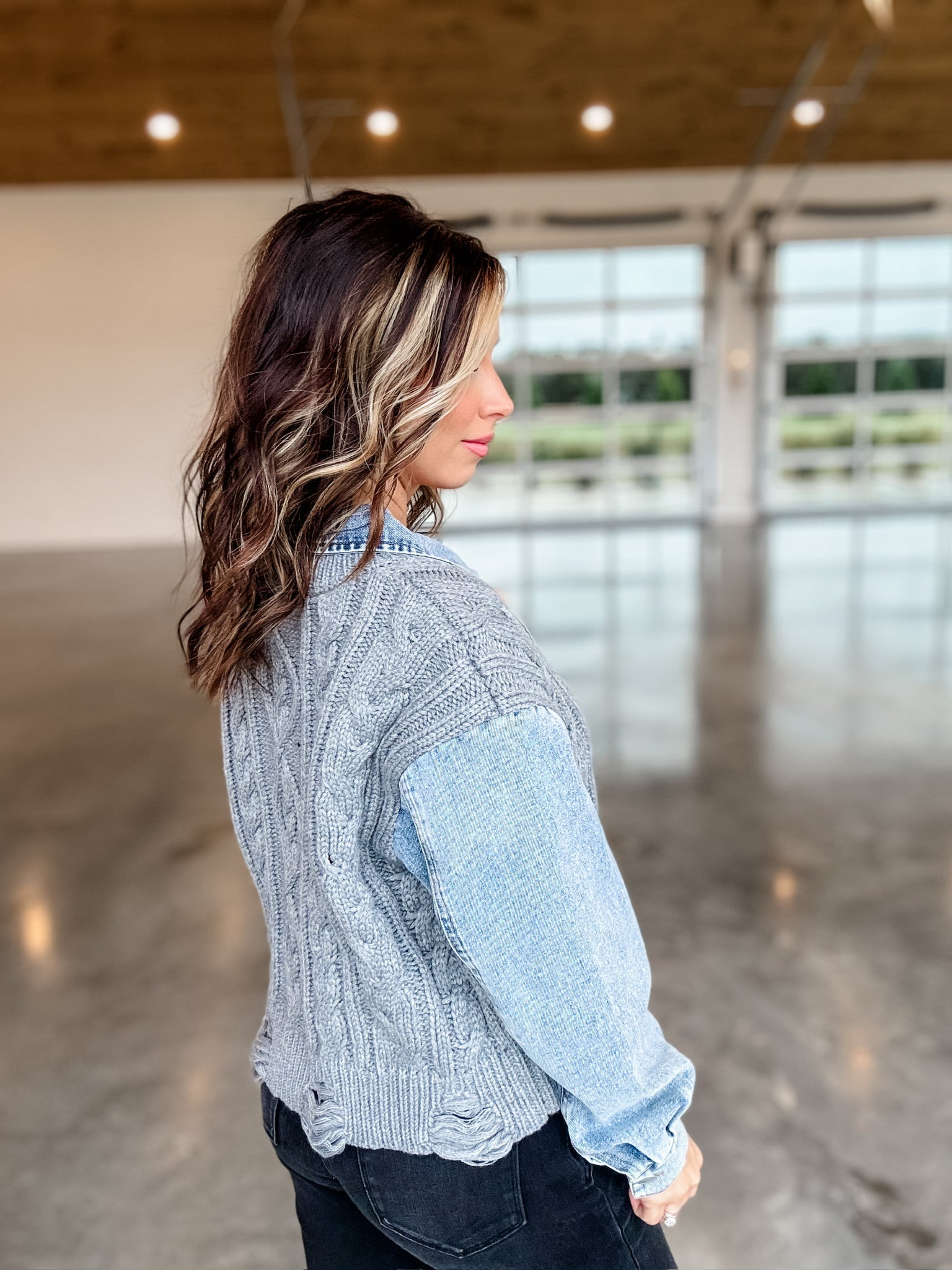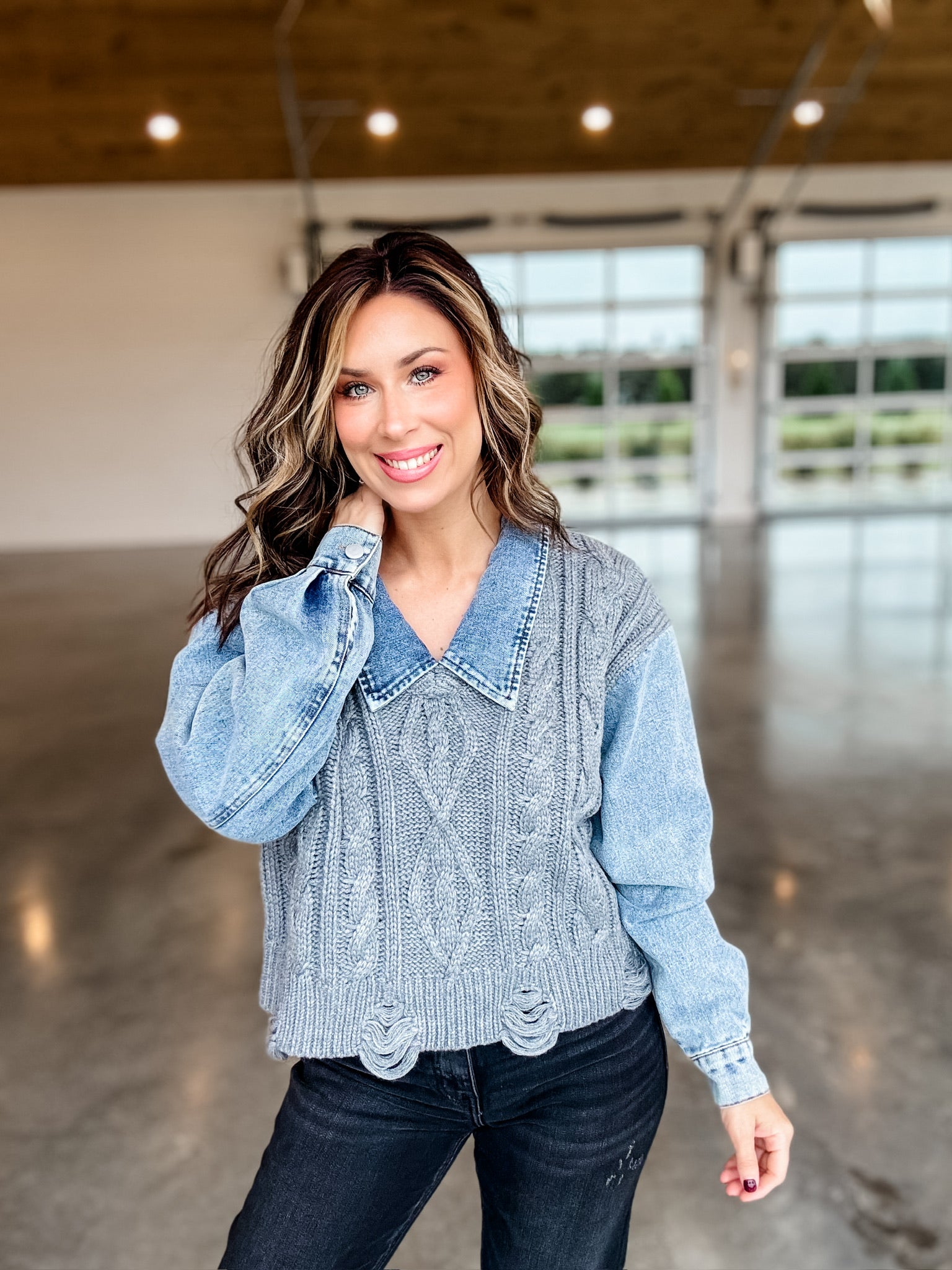 This versatile top combines the classic look of denim with the comfort and warmth of a sweater. The denim sleeves and collar add a touch of style to any outfit, making it perfect for both casual and dressy occasions. Stay stylish while feeling cozy in our No Limits Collared Denim Top.