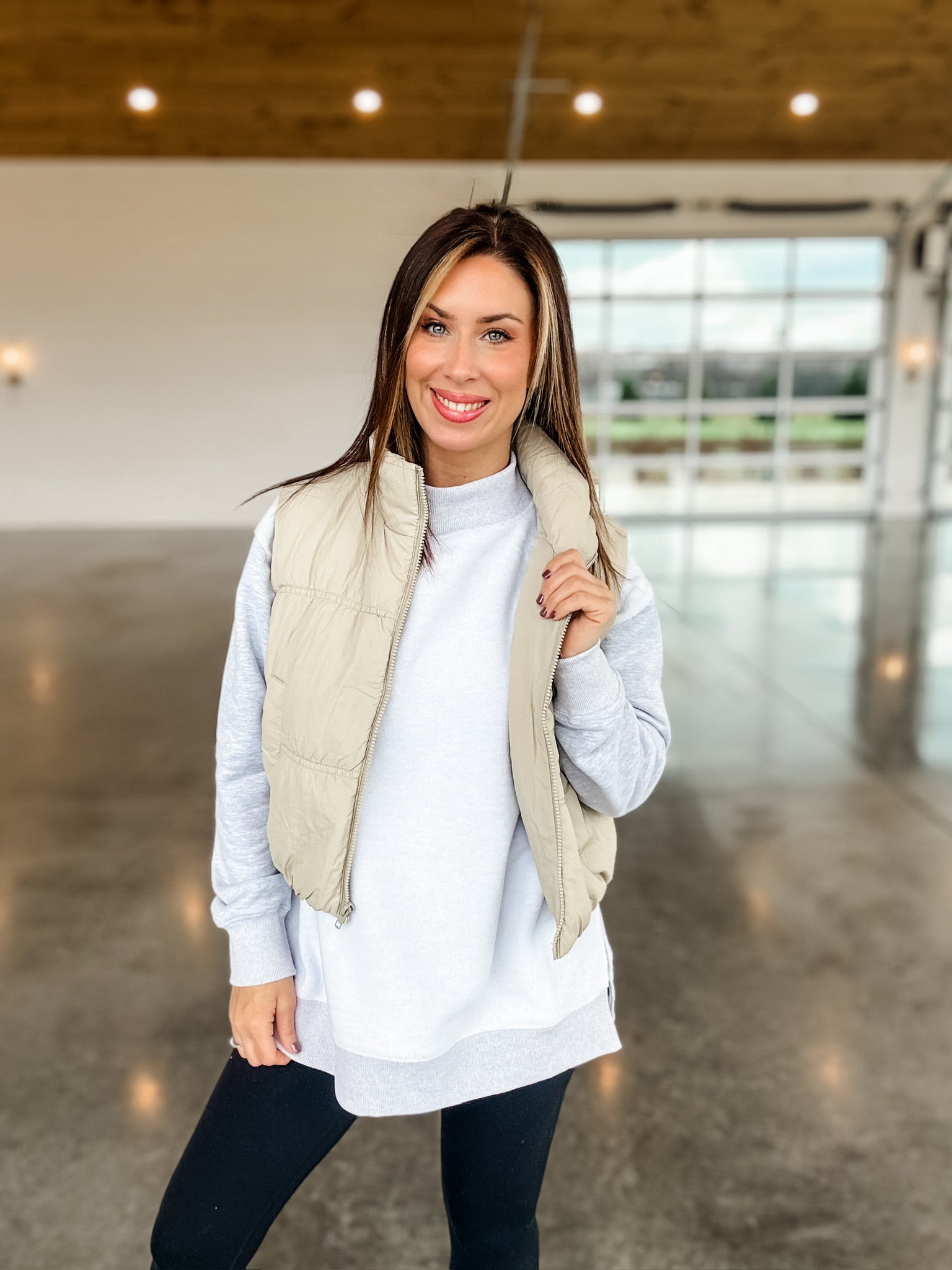 Stay warm in style with our Collared Zip Up Puffer Vest. Designed with a cropped hem and a classic collar, this vest is both stylish and functional. The cement color adds a touch of sophistication to any outfit. Perfect for chilly days, this vest will keep you cozy and fashionable.