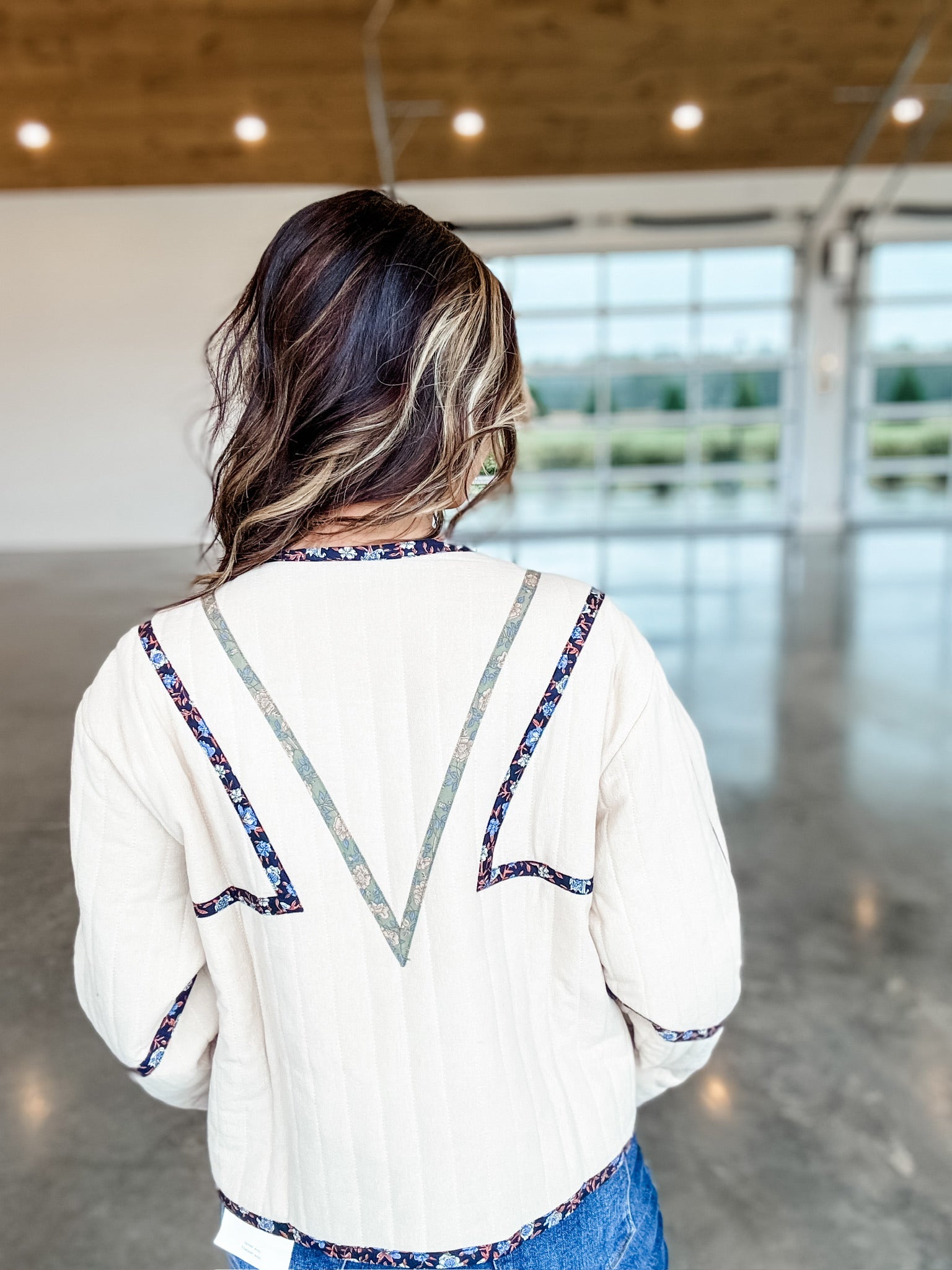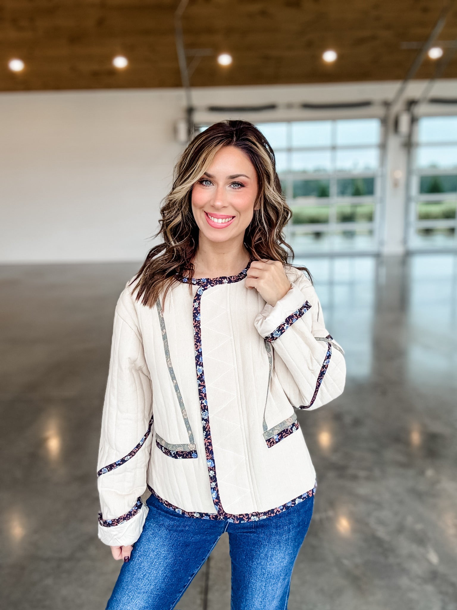"Stay warm and stylish with the Take Me There Quilted Jacket. Featuring a beautiful floral border, this quilted jacket is as functional as it is fashionable. With its quilted design, it provides extra insulation for those colder days. Perfect for any outdoor adventure or casual outing."