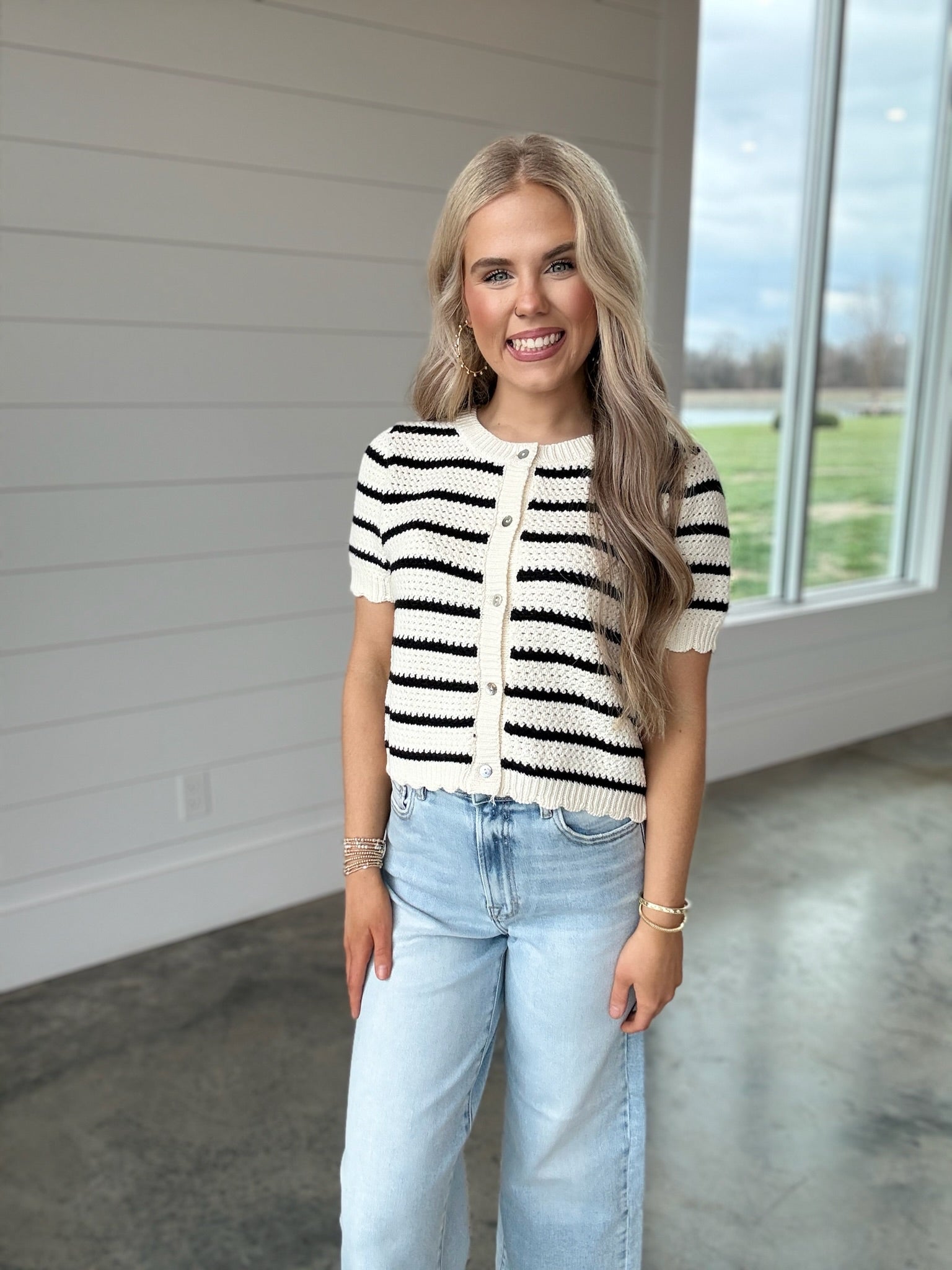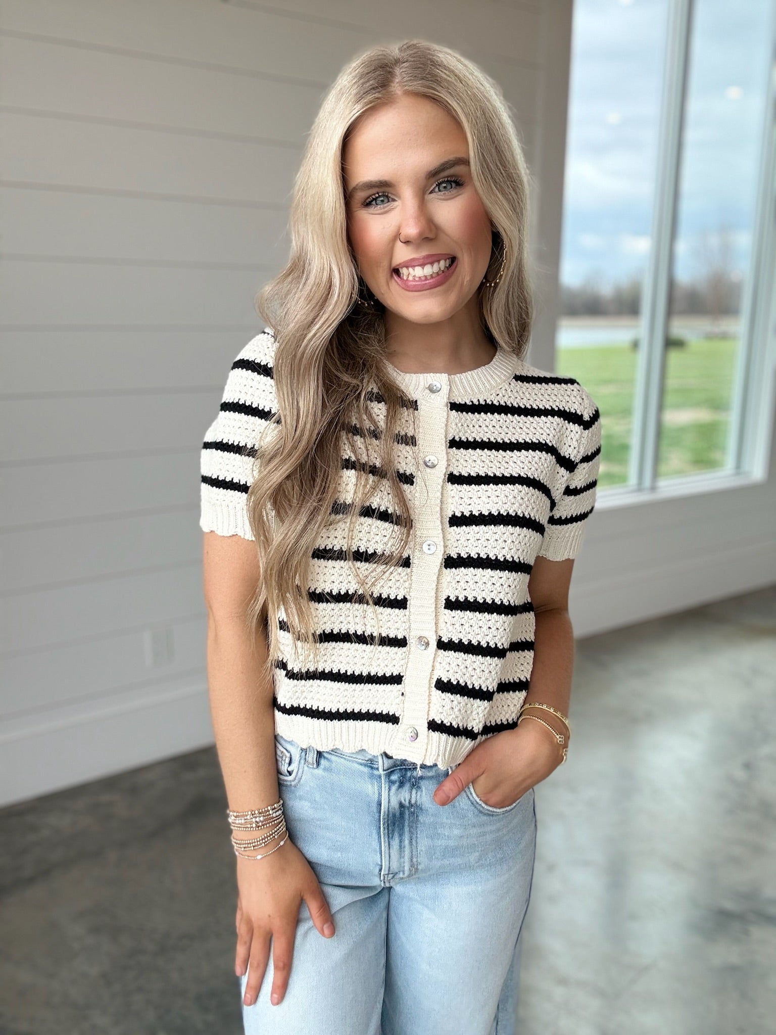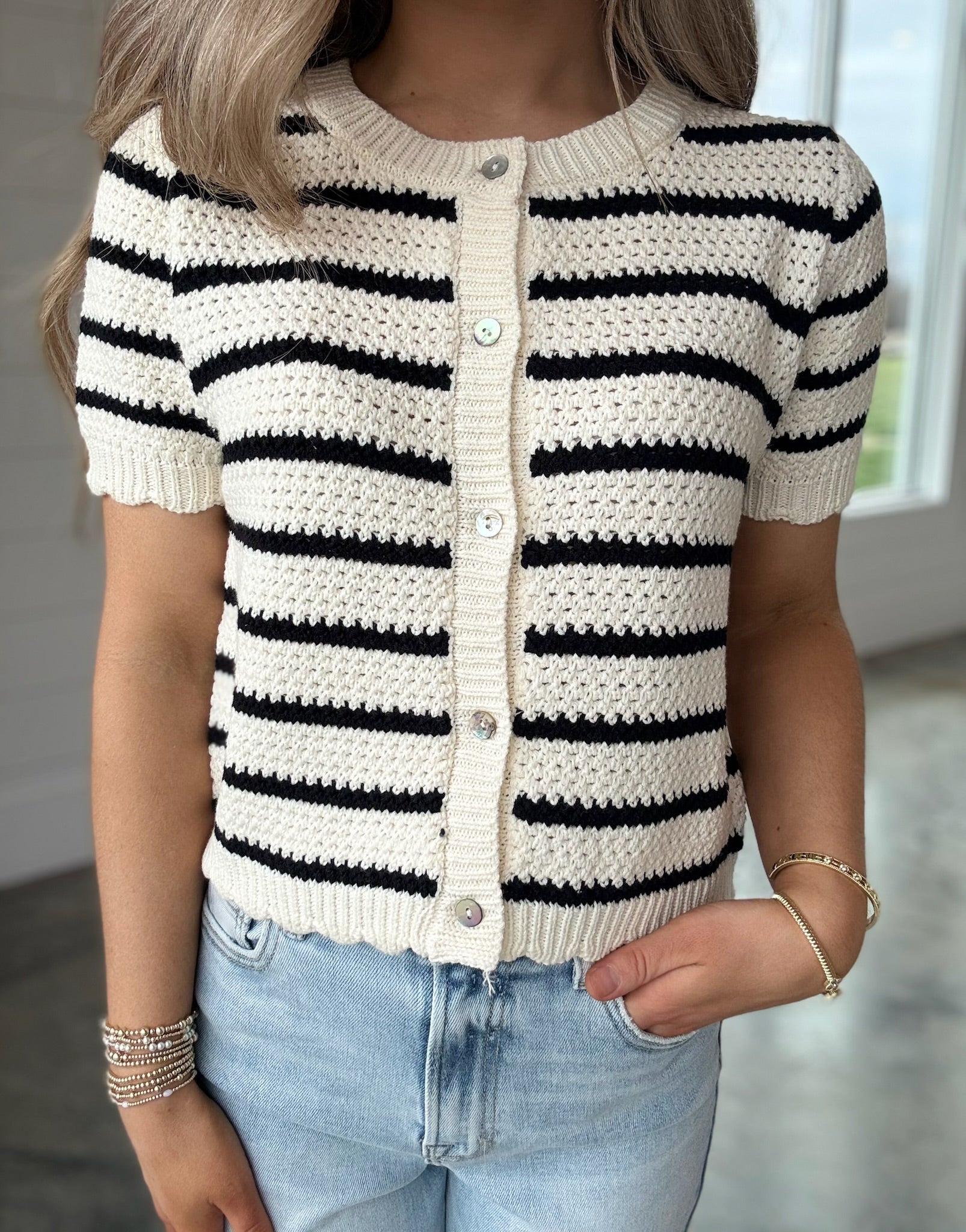 The Crochet Classic Top is a knitted sweater featuring a sophisticated black and white striped design. Its short sleeves provide comfort and breathability, making it suitable for varied climates. This versatile top combines style with functionality, enhancing your wardrobe with a timeless aesthetic.