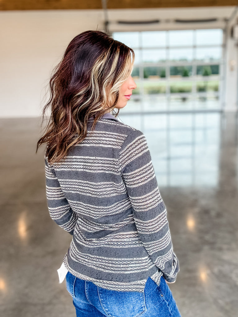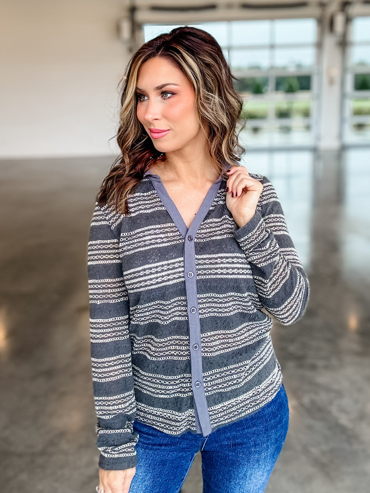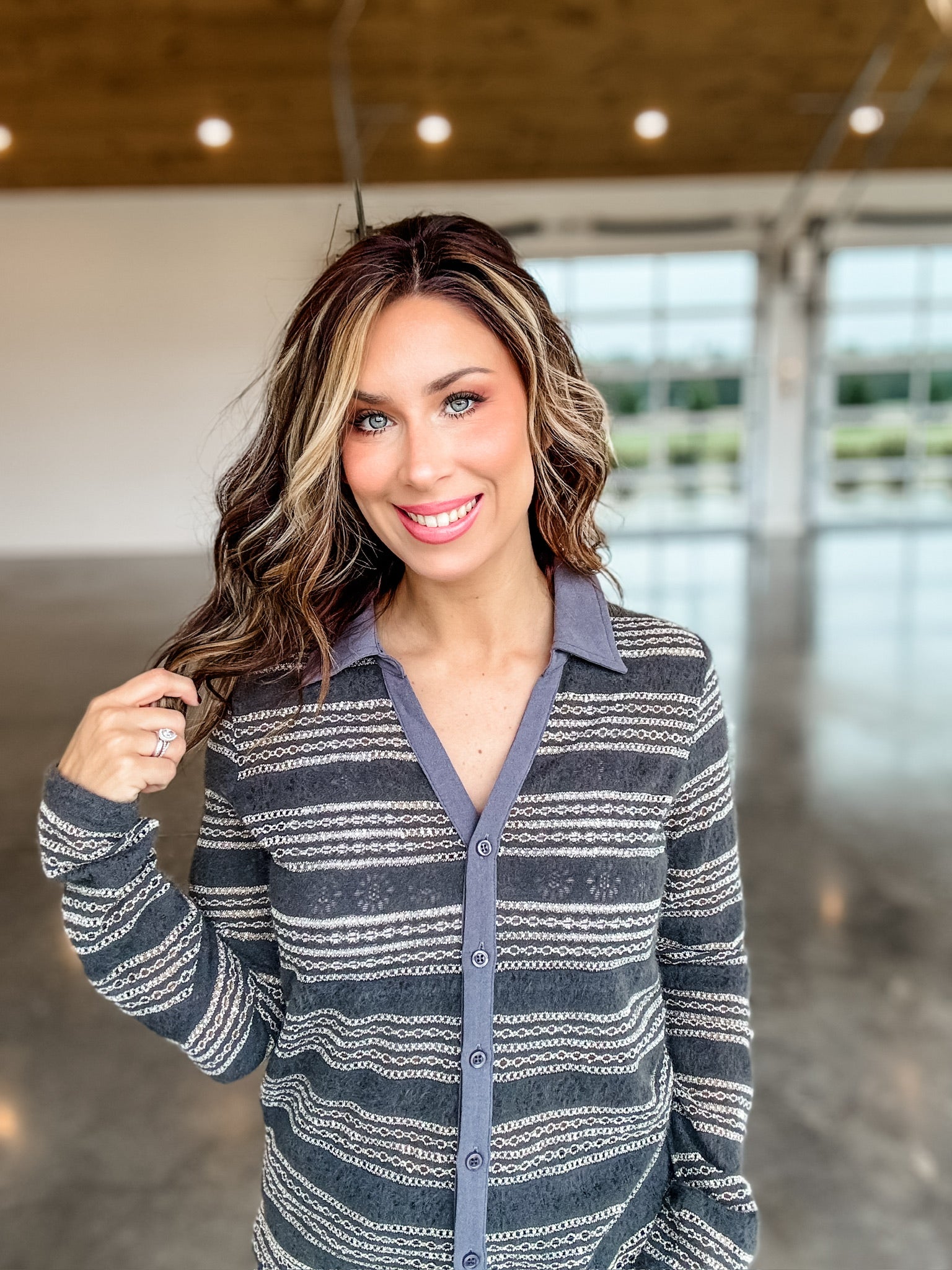 Upgrade your wardrobe with our Up To Something Top. Featuring a brushed, two-tone lace design and button down front, this top exudes elegance and sophistication. Perfect for any occasion, it will elevate your style and make you feel confident and put-together.