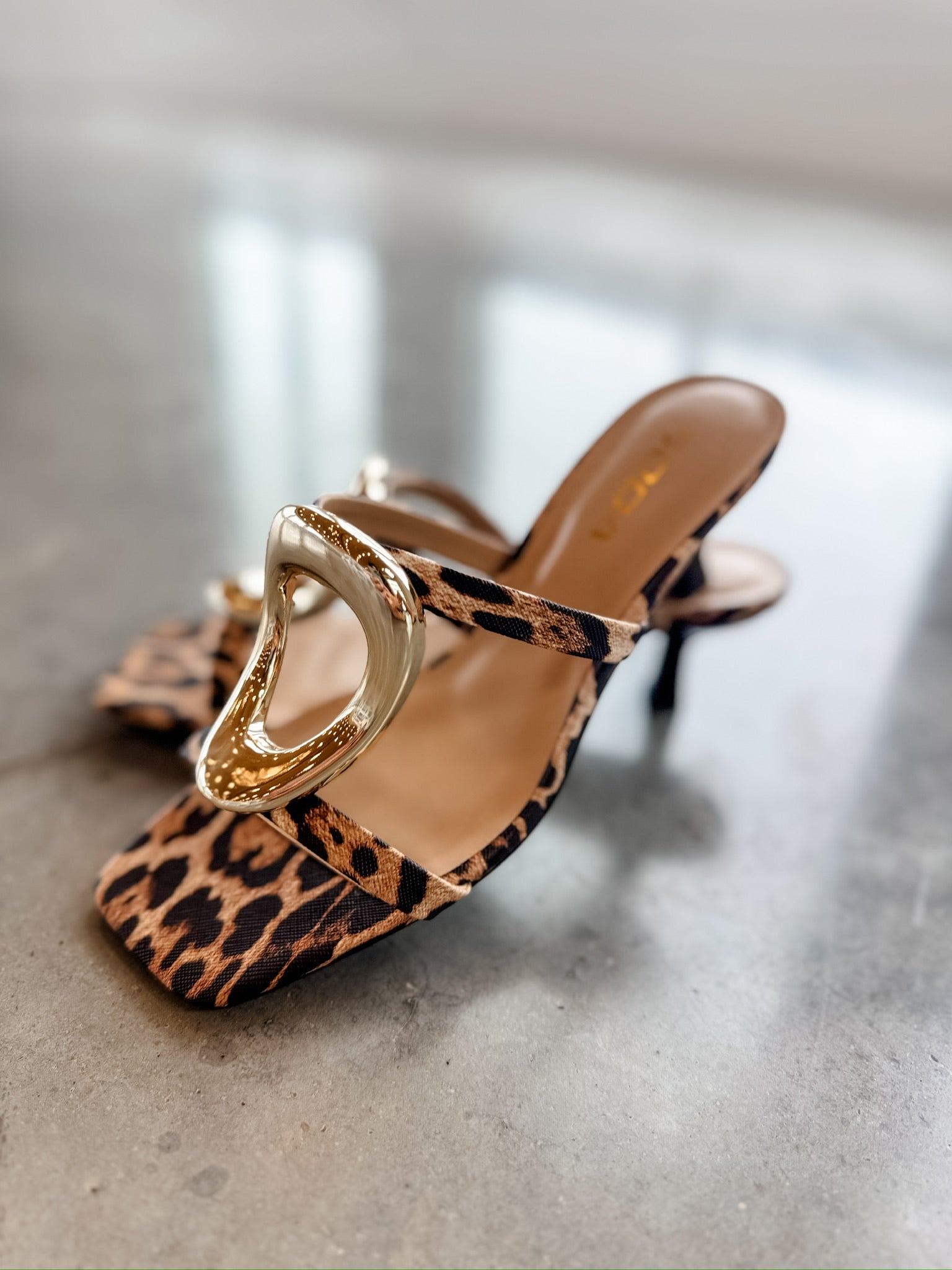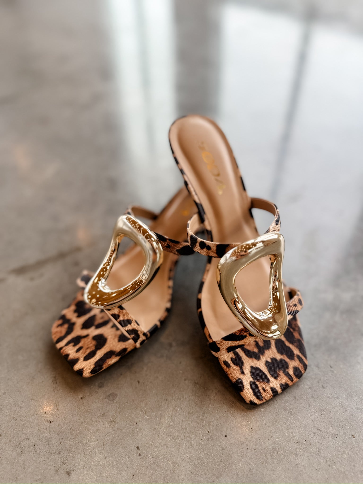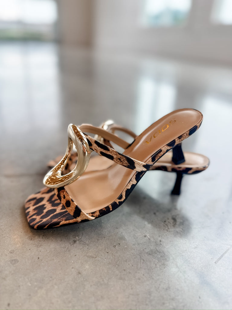 Discover a fierce and stylish look with our Soda Leopard Heels. Featuring a cheetah print design and a gold open middle front piece, these heels will elevate any outfit. The short heel provides comfort without compromising on style. Unleash your wild side with these statement heels.