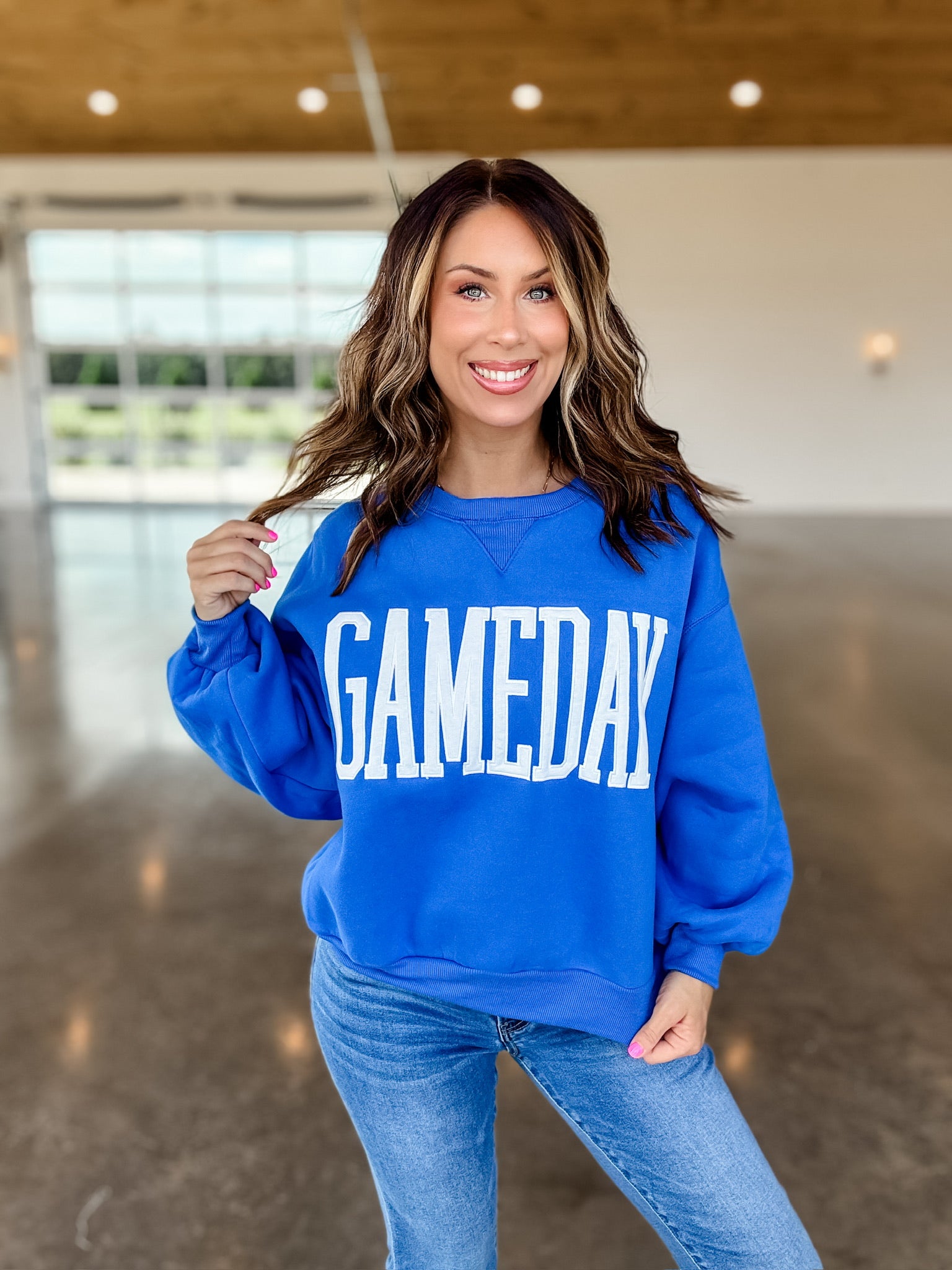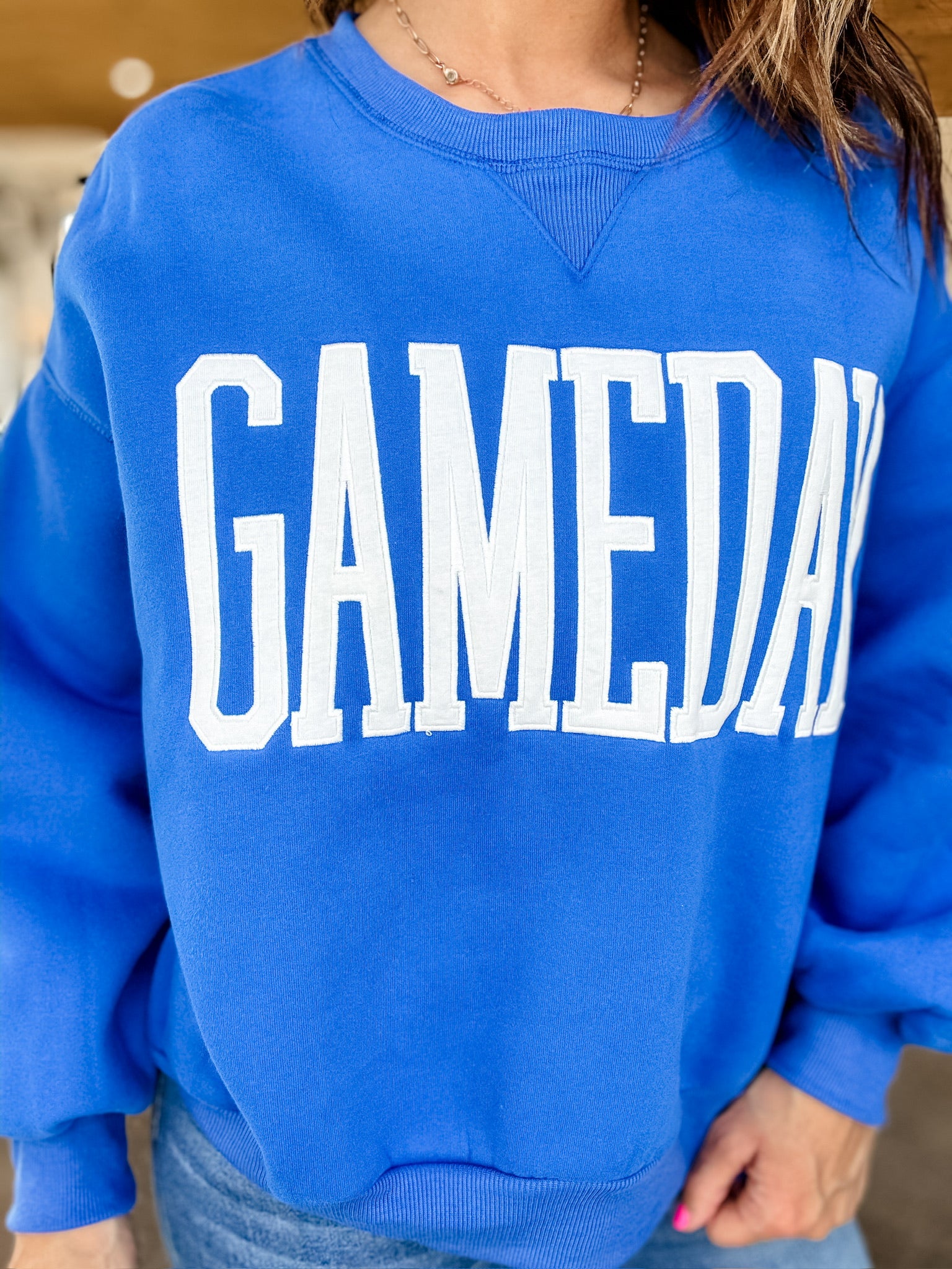 Expertly designed for stylish comfort, this Blue waist length Gameday Crewneck features a classic crew neck and "Gameday" printed in heather gray. Made with high-quality materials, this trendy piece is perfect for showing off your team spirit while staying cozy and fashionable.